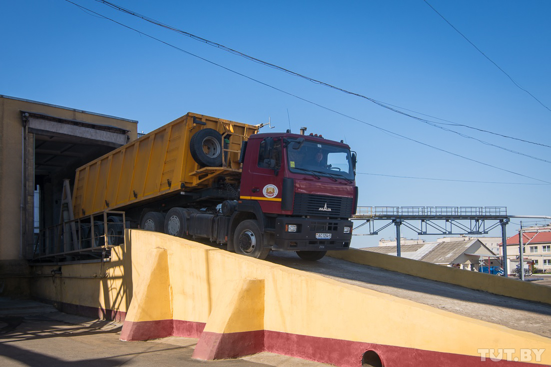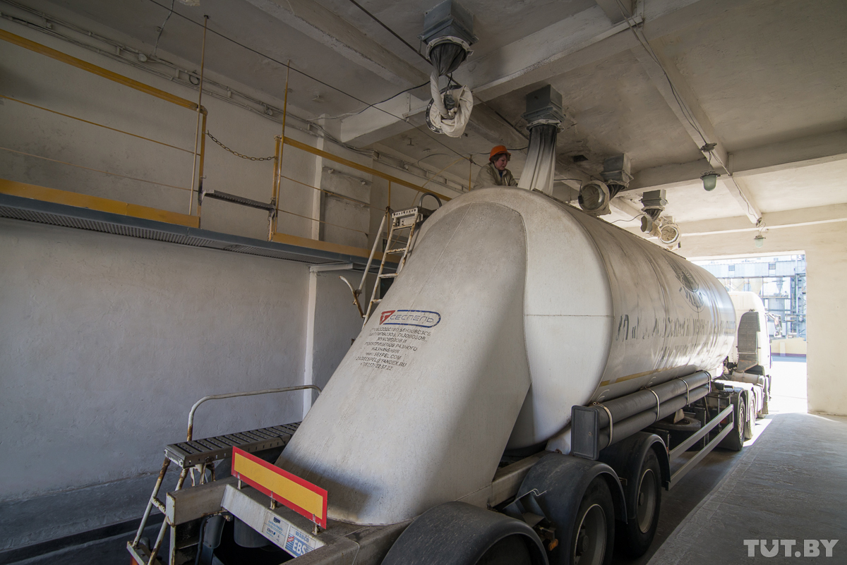 По цепным конвейерам мука поступает в отделения бестарного хранения, куда подъезжают муковозы. В отверстия грузовиков поступает рукав, и под собственным давлением мука распределяется по всему пространству муковоза. Это занимает около 40 минут.