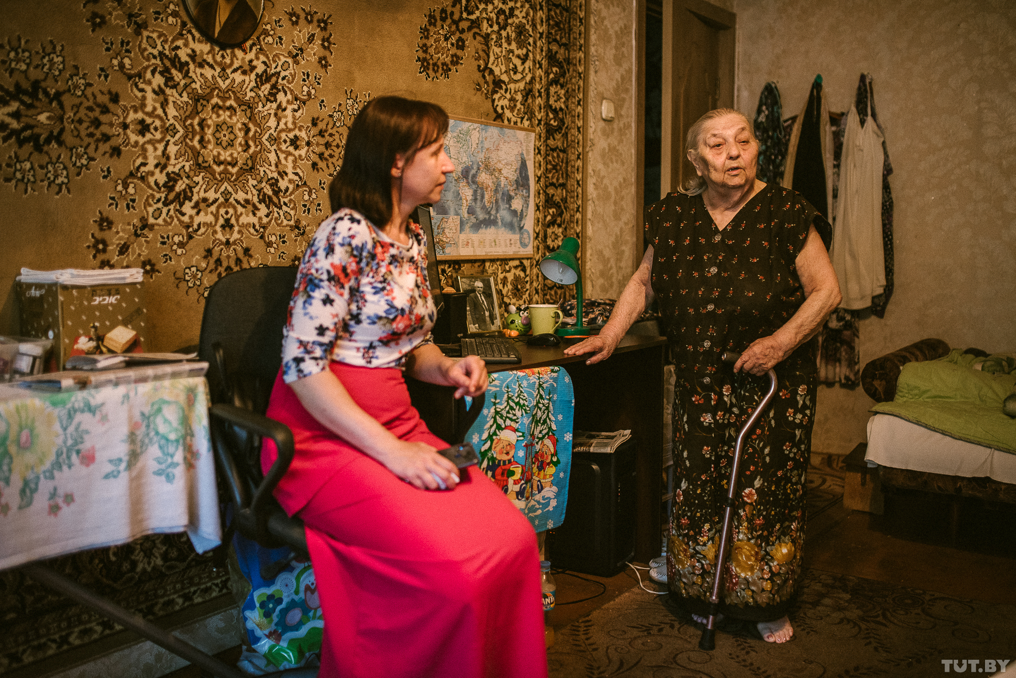 Мы приходим в гости к Майе Владимировне вечером после работы. Оксана отпрашивается, чтобы успеть — она работает в спорткомплексе «Уручье» и там в связи с подготовкой Европейских игр горячая пора. Живут они по соседству. И Оксана, когда Майя Владимировна просит, прибегает помочь — купить продукты, лекарства и просто поговорить. А еще они дружат в соцсетях.