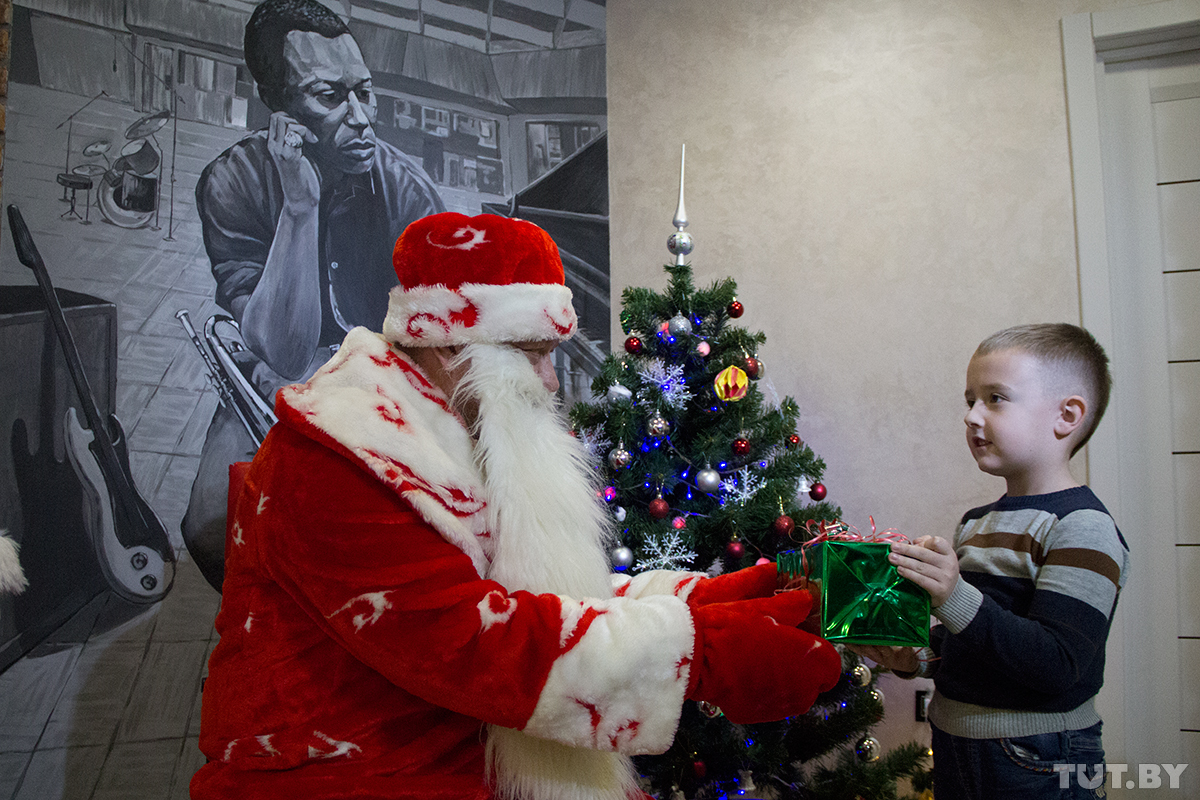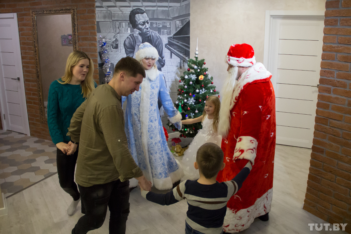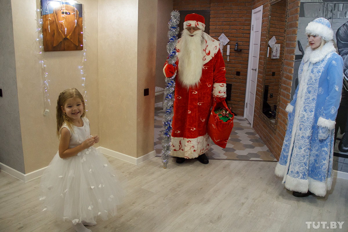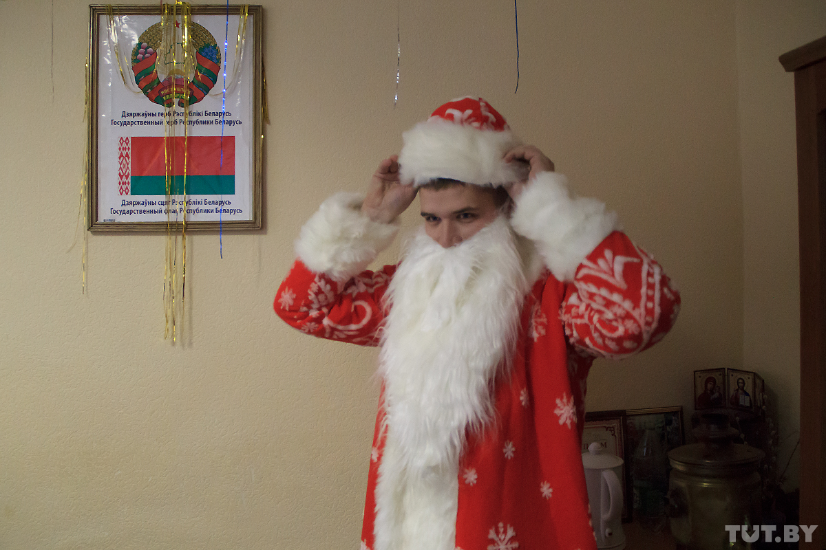— У меня костюм свой, — рассказывает Дмитрий Матюш. — Купил в магазине «Белорусский мех», чтобы своих детей поздравлять. Теперь вот наряд пригодился и здесь. Еще два костюма — для «подменного» Деда Мороза и Снегурочки — нам выделили.