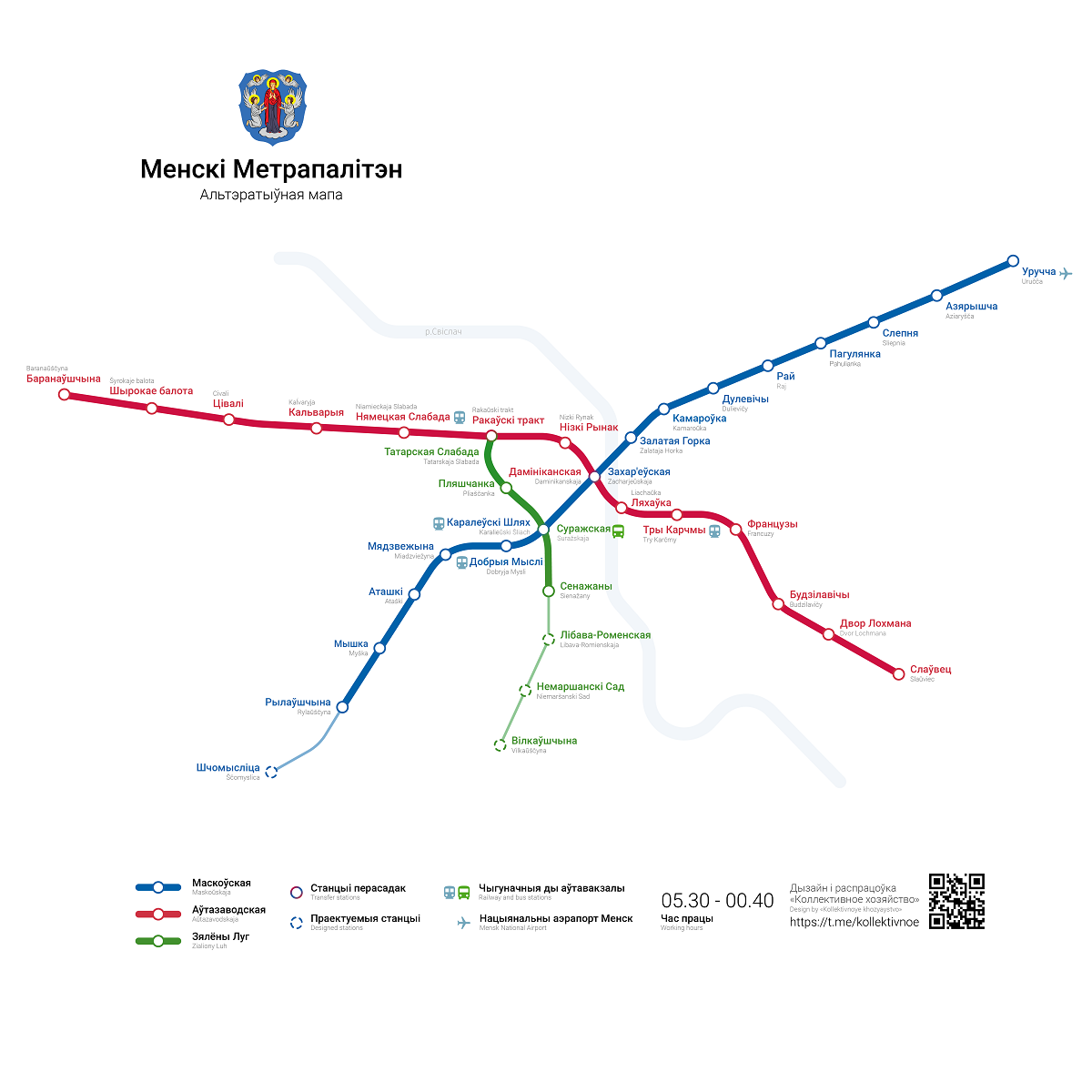 Мышка — название реки, которая течет возле станции «Малиновка», — так на схеме появилась станция метро «Мышка». Станцию «Парк Челюскинцев» переименовали по названию деревни — Рай. Станция метро «Немига» стала «Низким Рынком», «Октябрьская» — «Захарьевской», «Спортивная» стала «Тивали», а «Каменная Горка» — «Барановщиной».