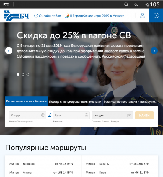 Ниже — блок с расписанием и поиском билетов, а также популярными маршрутами и их ценой. На главной странице ресурса также находится блок, посвященный II Европейским играм в Минске. Рядом — информация для пассажиров вроде порядка пересечения границы и правил провоза ручной клади.
