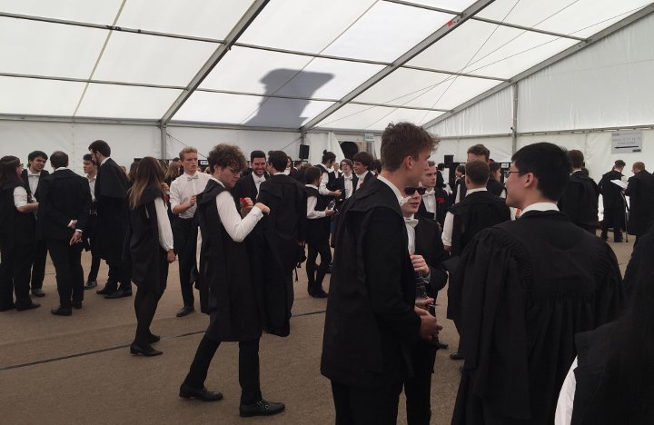 «Как правило, ходить на экзамены и важные мероприятия надо только в черных носках, — рассказывает Лиза. — Это традиция, а к традициям здесь относятся серьезно. Когда перед началом выпускного организаторы заметили, что у меня красные носки, отказывались пропускать меня в колледж. Пришлось объяснять, что я войду и переодену». Фото: личный архив Лизы Трахалиной