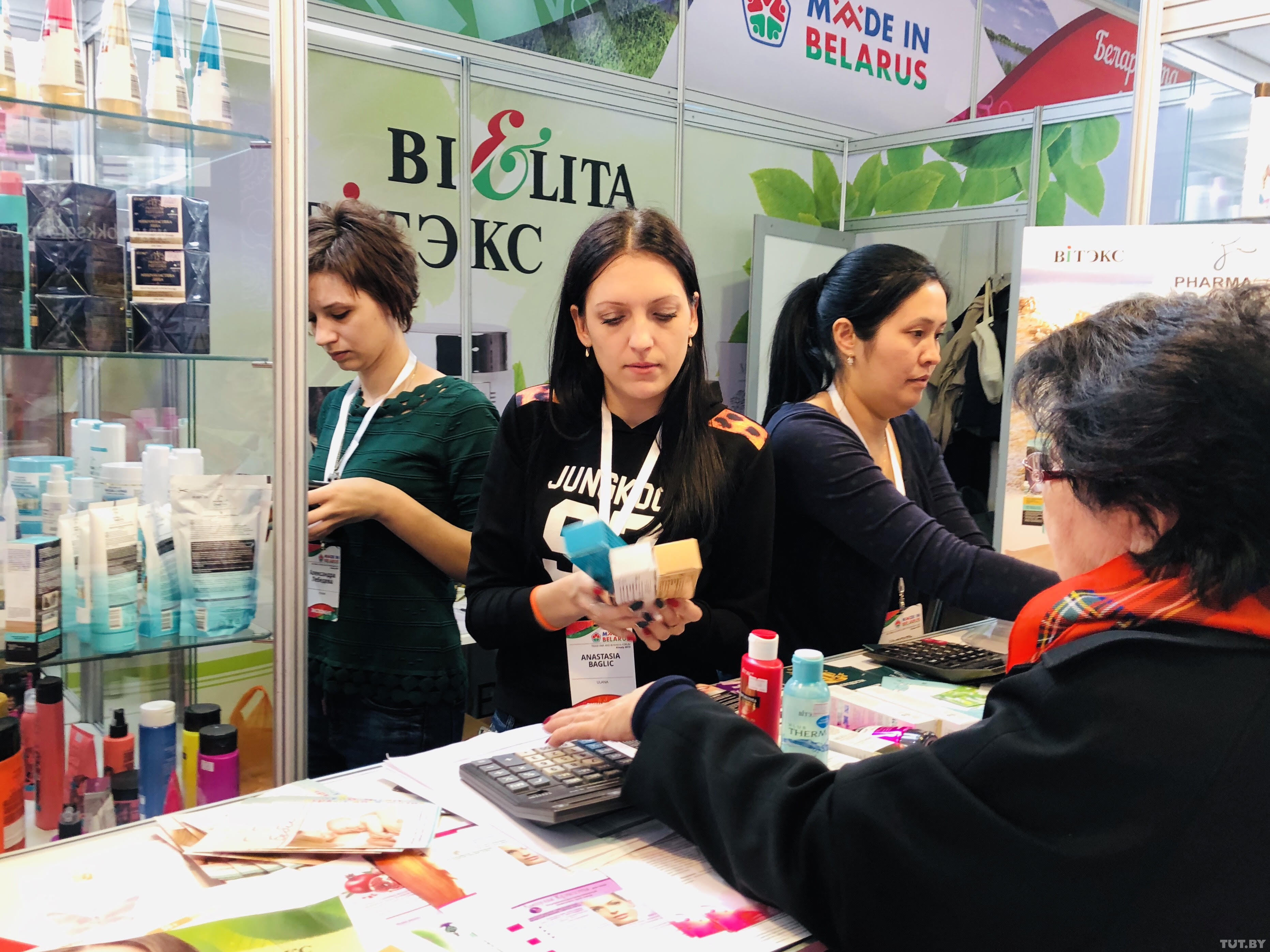 Первый стенд на входе — белорусская косметика «Белита» и «Витекс», здесь очередь за шампунями и кремами.