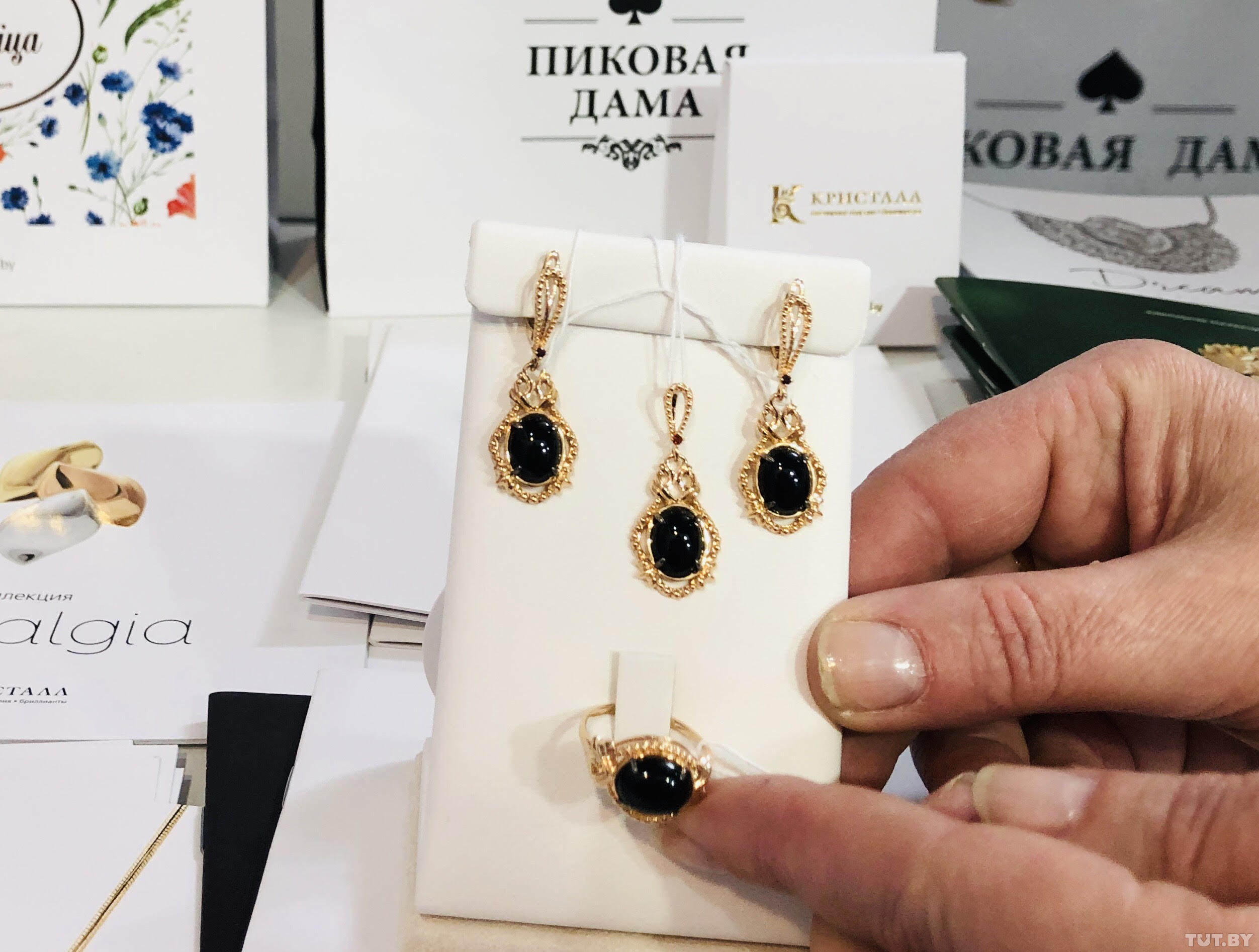Рядом витрину обступили любители ювелирных украшений. Гомельский завод «Кристалл» привез в Алматы коллекцию «Византия» в античном стиле из золота с натуральными неограненными алмазами и бриллиантами. Здесь же впервые презентуют коллекцию «Пиковая дама» с черными натуральными агатами.