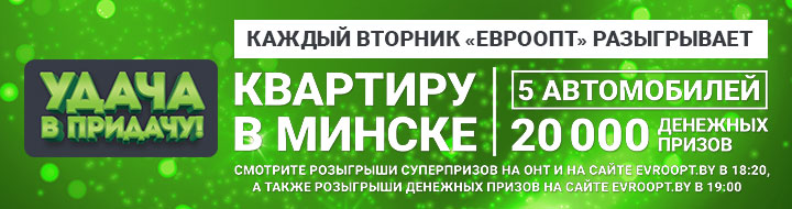 Во вторник, 25 сентября, в игре «Удача в придачу!» «Евроопт» разыграет квартиру в Минске, ПЯТЬ автомобилей, а также более 20 000 денежных призов! Следите за розыгрышем в 18.20 на телеканале ОНТ, сайте evroopt.by, а также в официальных группах «Евроопт» в социальных сетях!
