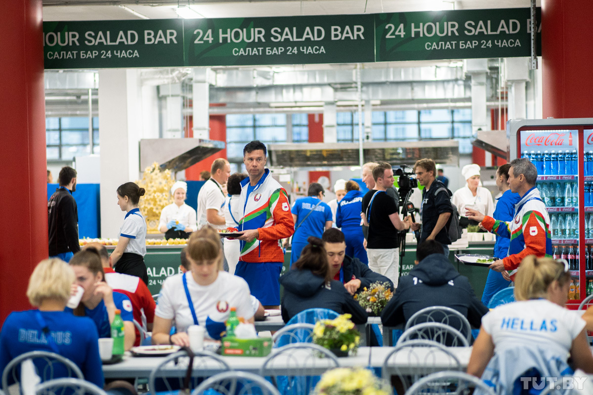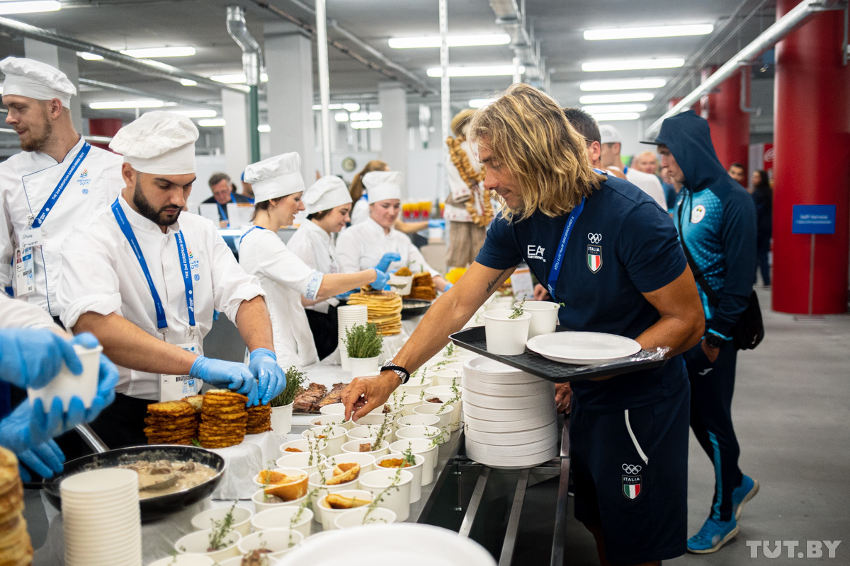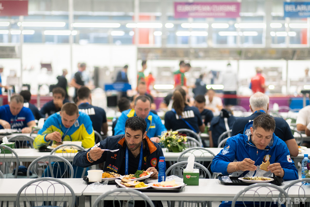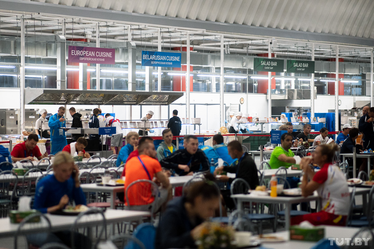 Каждый день в меню столовой Деревни спортсменов примерно 250−300 блюд. Из них где-то 50 традиционно белорусских. На кухне трудится около 150 поваров. Меню составлено на семь дней. Потом ассортимент повторится.