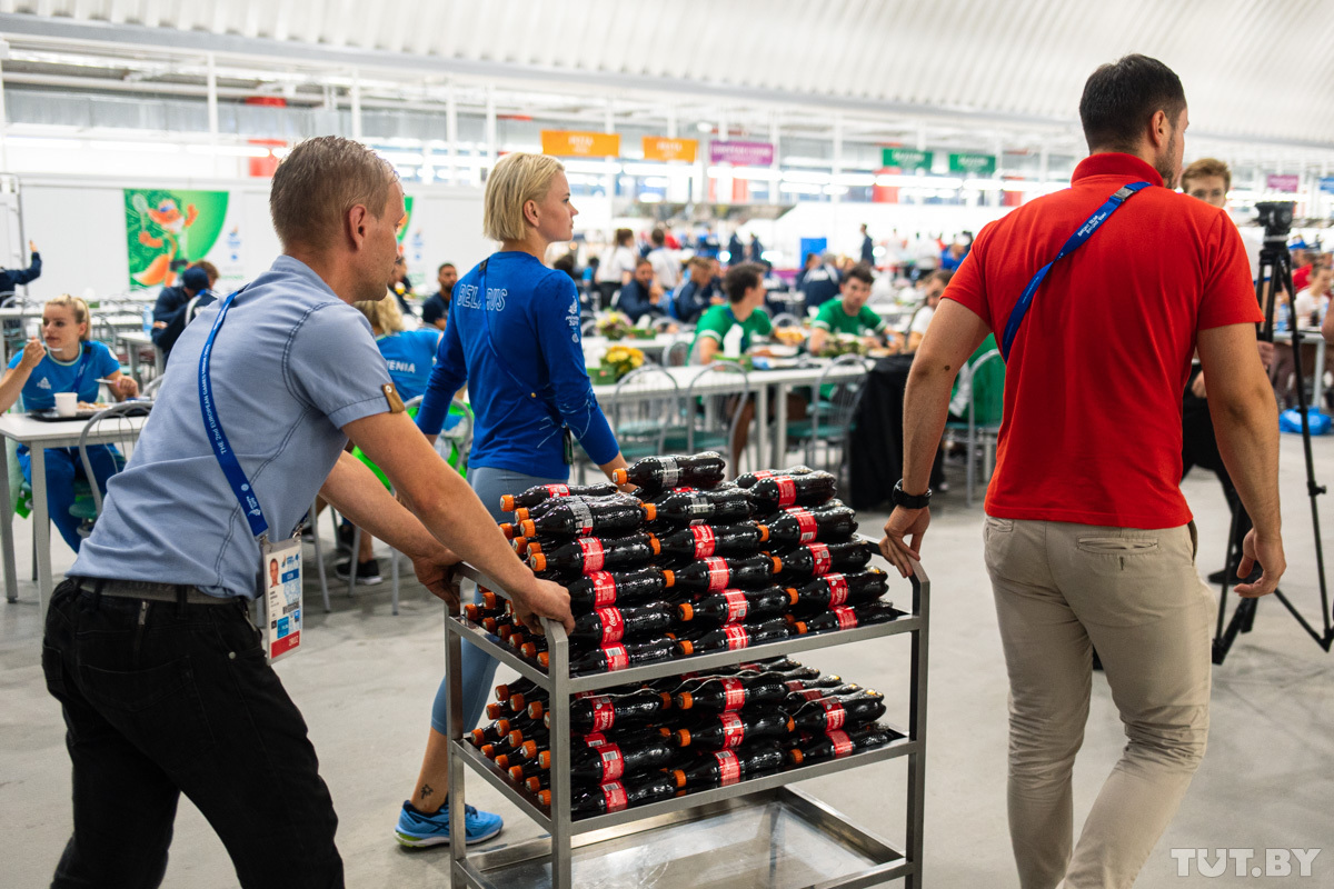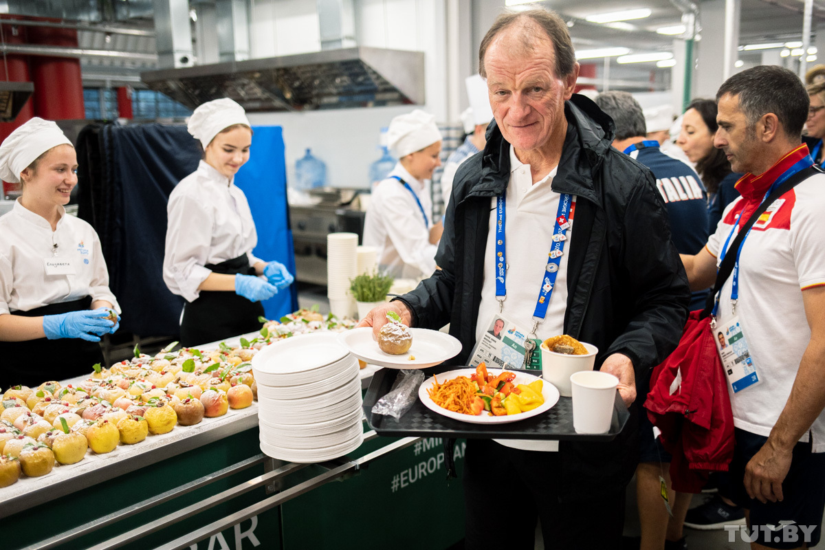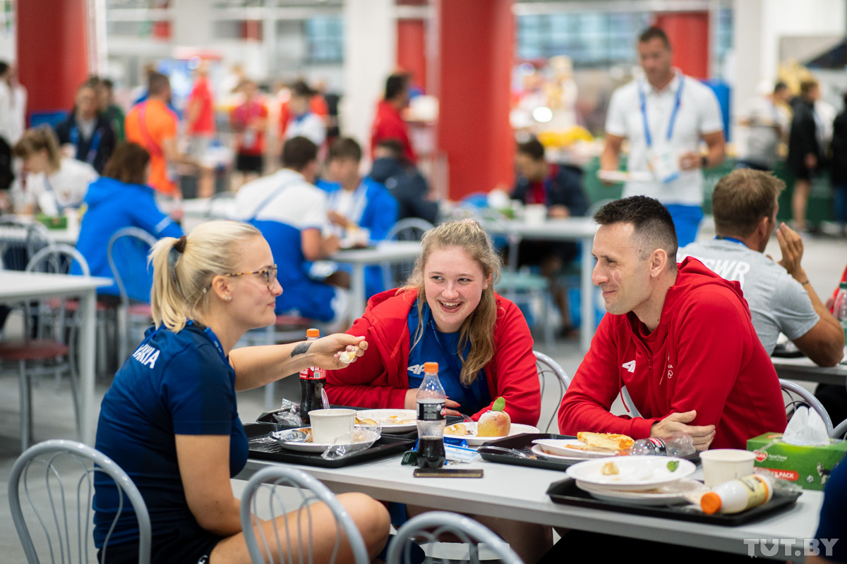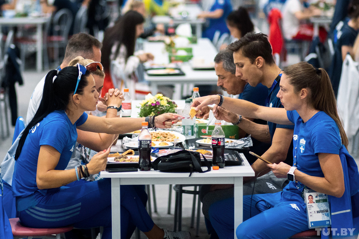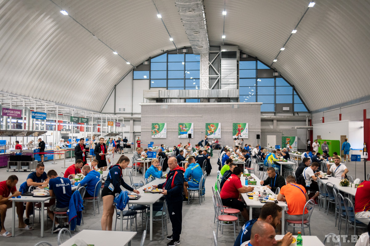Каждый день в меню столовой Деревни спортсменов примерно 250−300 блюд. Из них где-то 50 традиционно белорусских. На кухне трудится около 150 поваров. Меню составлено на семь дней. Потом ассортимент повторится.