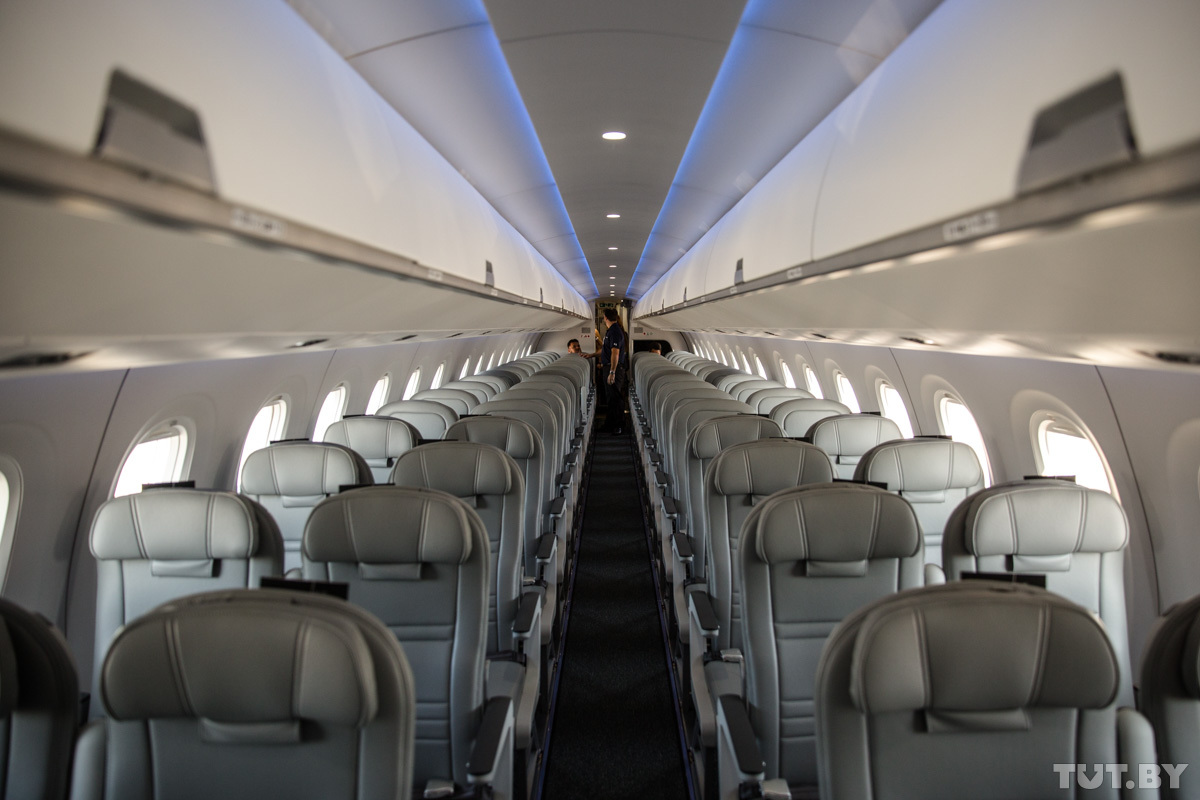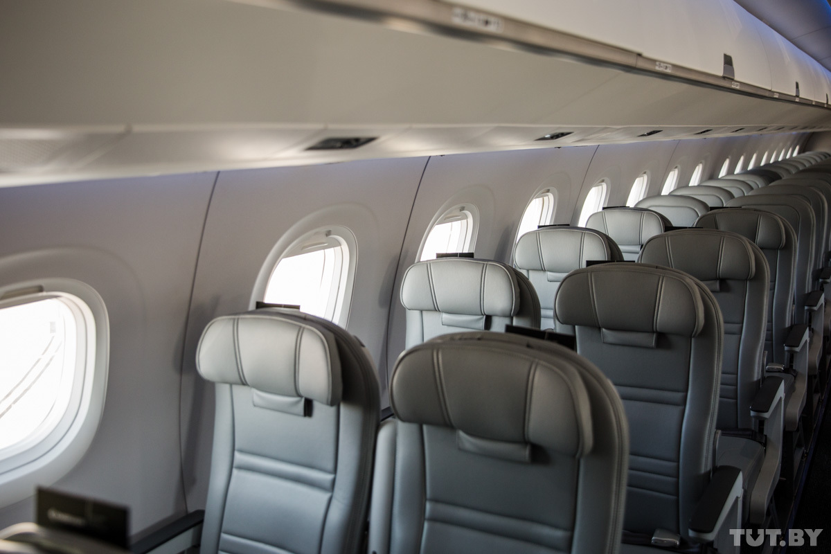 Все это в конечном итоге сказывается на стоимости билета. Что заметят пассажиры при входе в новый самолет? Компоновка кресел — по два в ряд, через проход еще два. Каждый пассажир может взять с собой одну ручную кладь, площадь багажного отделения внутри салона значительно увеличилась. Расстояние между креслами от 35 до 29 дюймов — чем ближе хвост самолета, тем меньшее расстояние. Кресла оборудованы розетками и USB-портами (эта дополнительная опция будет установлена в зависимости от комплектации), столики на креслах тоже разные — от широких раскладных в начале салона до простых и привычных для эконома (ближе к хвосту), кресла в бизнес-классе расставлены в шахматном порядке.