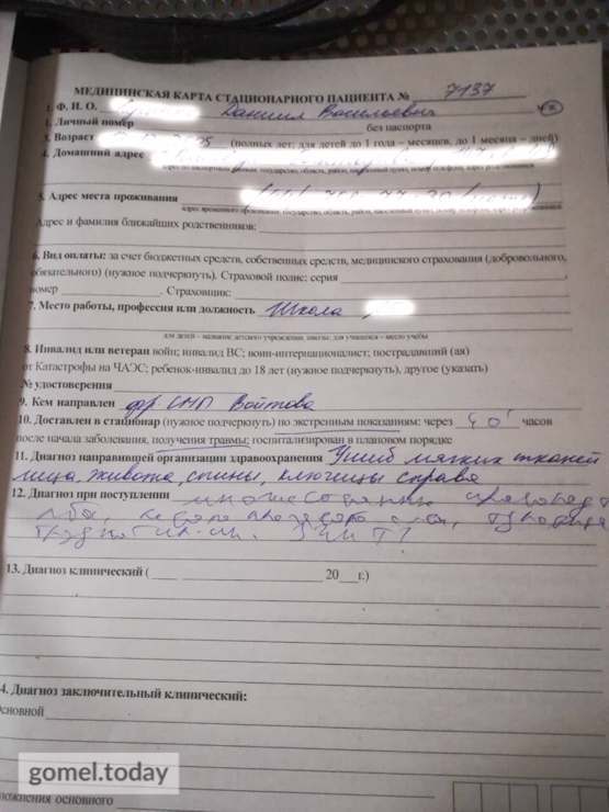 Вечером 8 сентября в Рогачеве на детской площадке взрослый мужчина избил 12-летнего мальчика. Мама пострадавшего Даниила, Наталья, рассказала, что сына домой привели дети со двора. Ребенок был напуган, в ссадинах, без майки. Родители сразу же обратились в милицию с заявлением. После мальчика доставили в приемное отделение больницы.