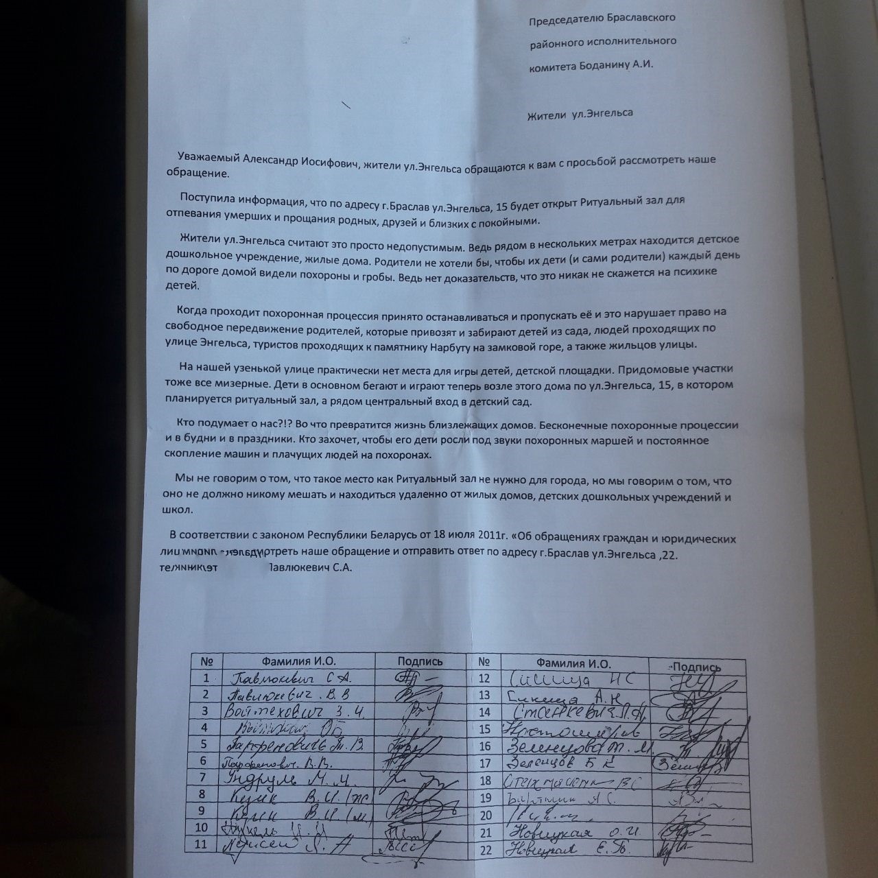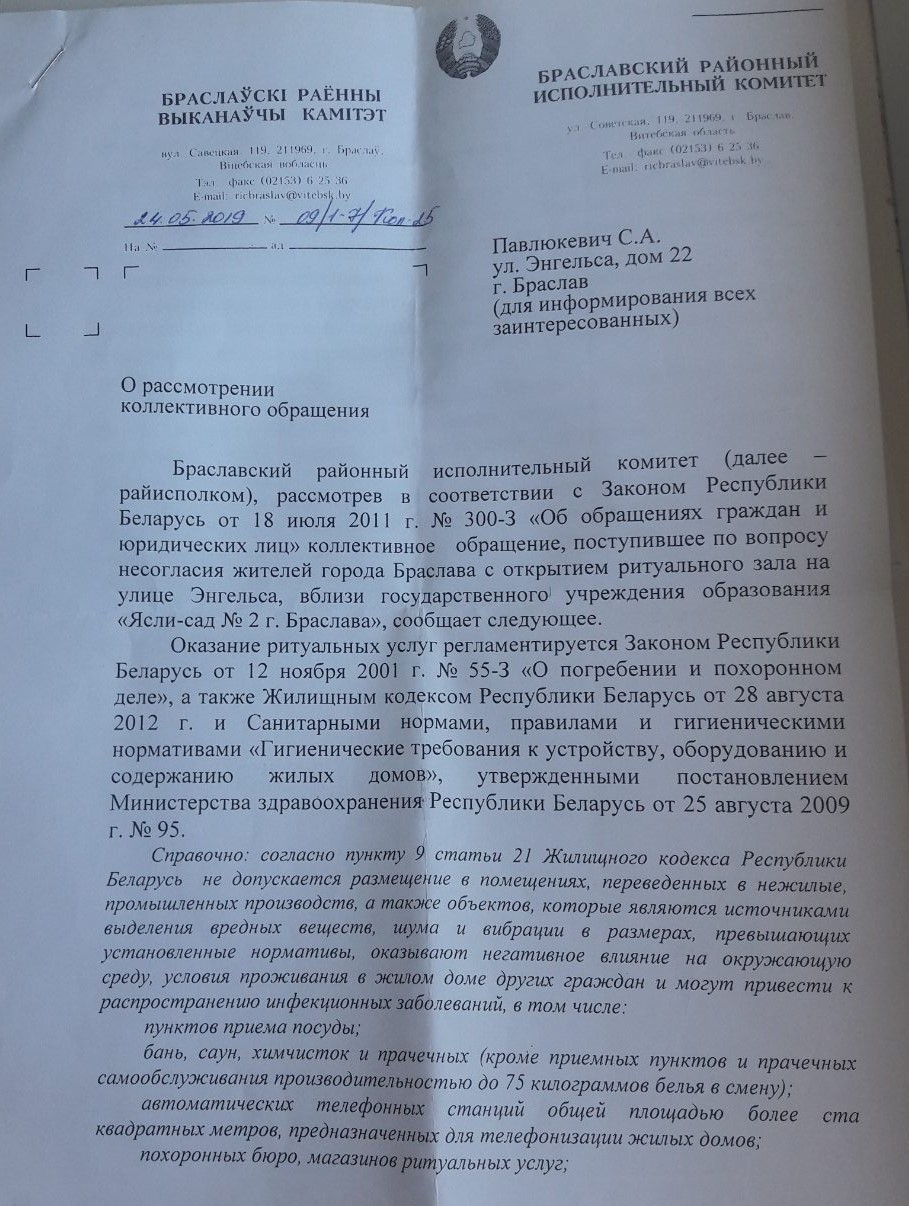 Подписавшие обращение горожане считают, что ритуальный зал нужен Браславу, но он должен находиться подальше от жилых домов, школ и садиков.