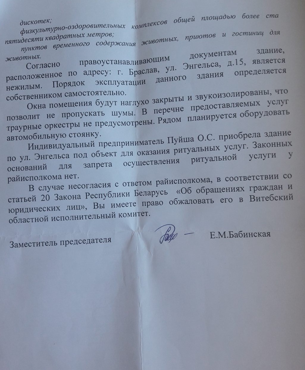 Думаю, не стоит бояться соседства с ритуальным залом. Во-первых, это отдельное закрытое помещение, во-вторых, половина Браслава — это частная жилая застройка, и, вероятнее всего, по устоявшейся традиции люди по-прежнему будут провожать родных в последний путь из своих домов. Поэтому встречи с ритуальной процессией на улице Энгельса вряд ли будут частыми.