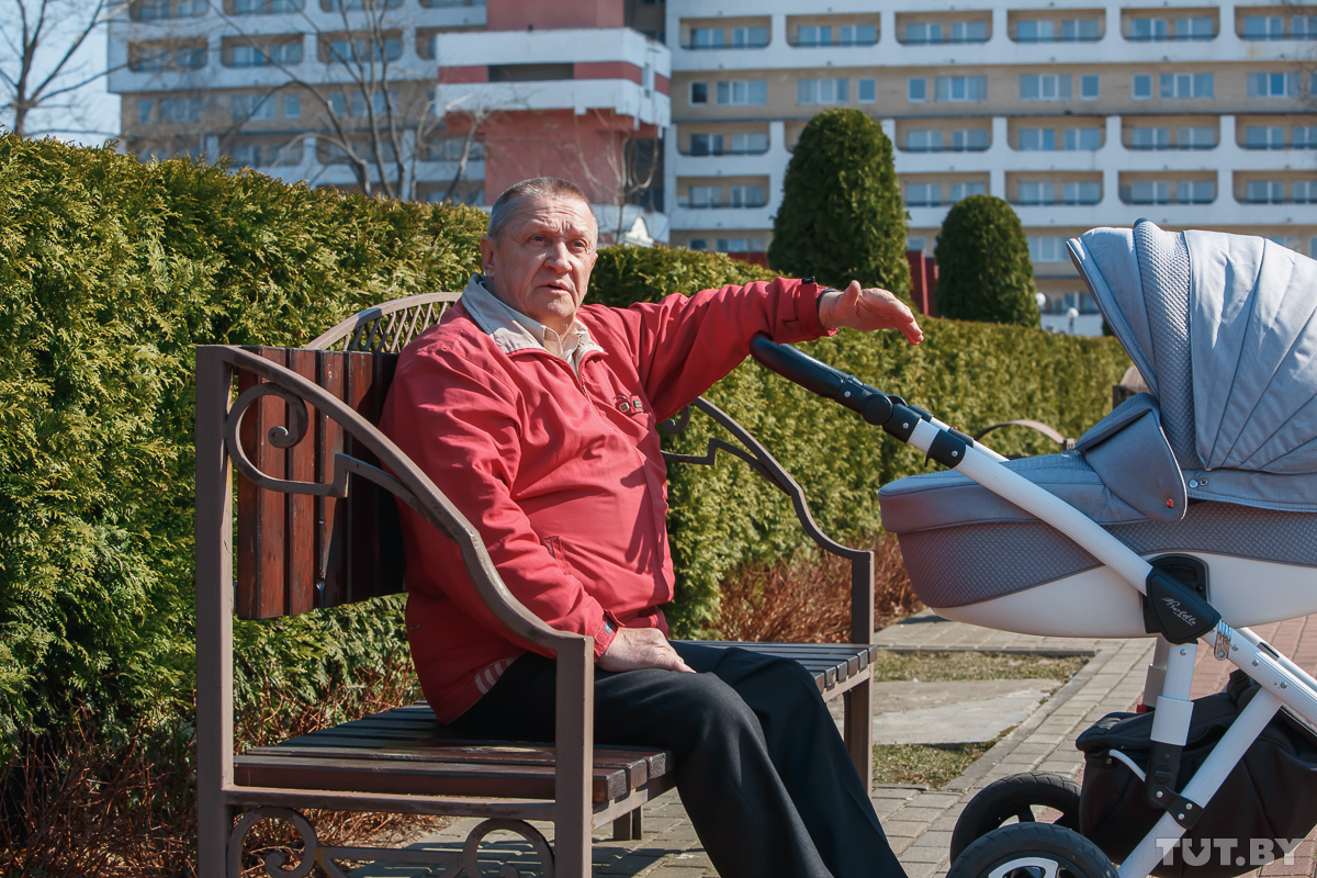 В парке знакомимся с еще одним горожанином — Валерий Иванович сидит тут с детской коляской:
