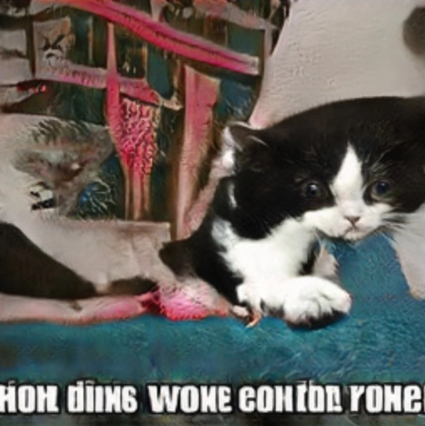 Учитывая, сколько в интернете мемов про котов, нейросеть попыталась создать и их. Правда, и животные получались «кривые», и язык в подписи система, видимо, придумывала сама. Попадались даже демотиваторы.
