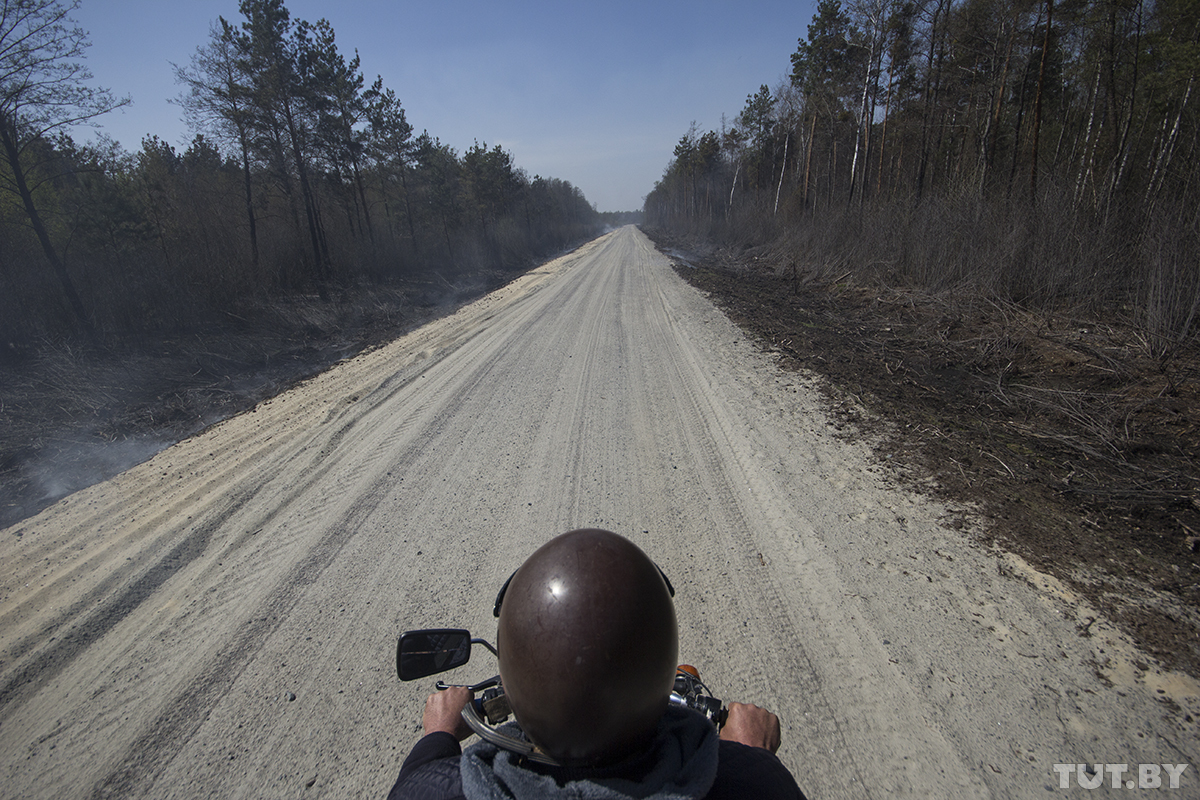 Возле штаба нас встретил генеральный директор Брестского государственного производственного лесохозяйственного объединения Алексей Прокопов. Времени у него мало, поэтому беседуем в служебном УАЗике по пути на место пожара. Дорога затянута дымом, сквозь который проглядываются черные пустыри, обгоревшие стволы деревьев и красные языки пламени, которые метр за метром проглатывают сухую траву, прорываясь все глубже в лес.