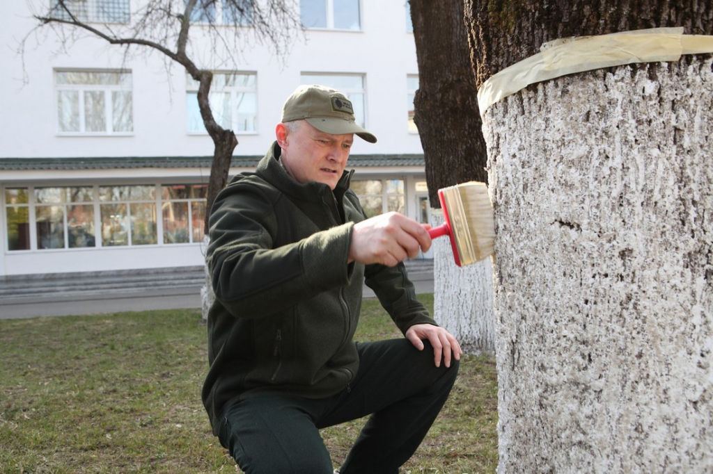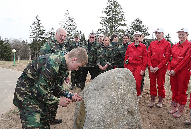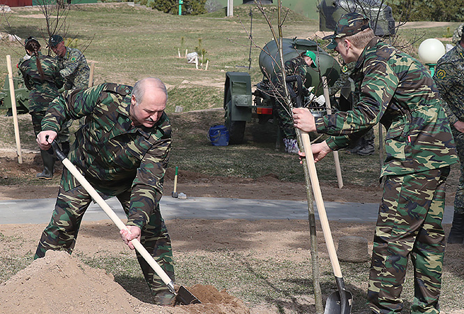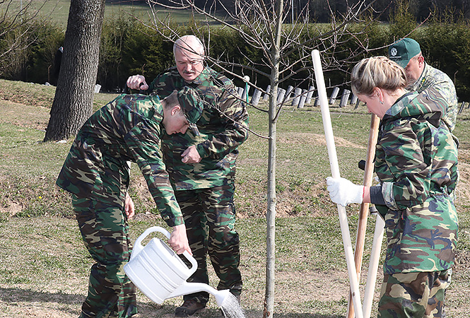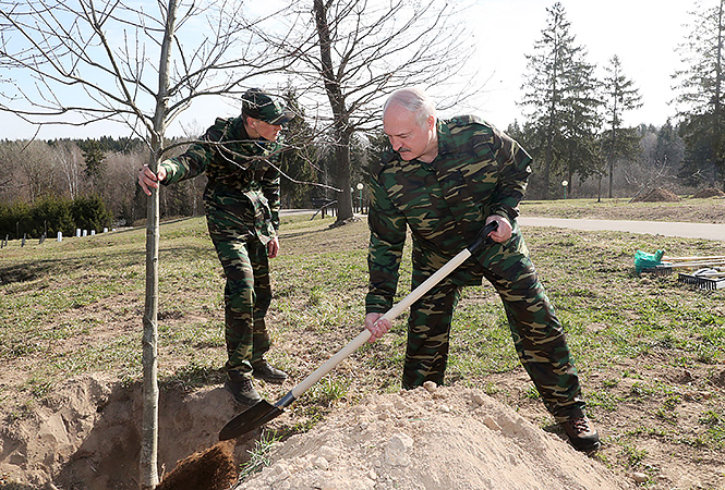 Президент Беларуси Александр Лукашенко 20 апреля принял участие в республиканском субботнике, высадив деревья на территории историко-культурного комплекса «Линия Сталина». С посадками ему помогал сын Николай Лукашенко и девушки в камуфляже и красных спецовках.