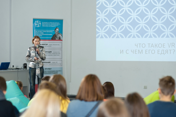 Ольга Елисеева, менеджер образовательных программ ООО «Мелсофт», наставник года — 2018 ОЦ ПВТ, доцент БГУ, кандидат технических наук, рассказала ребятам подробнее о VR на лекции и подарила каждой школе кардборд