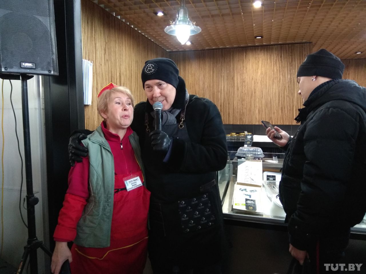 Александр Солодуха исполнял свои некоторые хиты, фотографировался с покупателями и зазывал людей покупать лосось, креветки и прочие морепродукты.