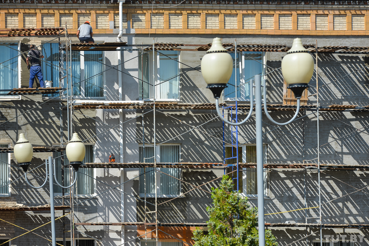 В лесах и здание райисполкома: ремонт фасада, говорят, начали с месяц назад. Тут же, на улице Кирова, возле нескольких домов суетятся рабочие. Всего сейчас на капитальном ремонте в поселке — 6 домов, говорит мастер по строительству Глусского жилкомхоза Сергей Борисик.