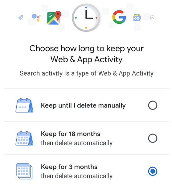 Теперь Google предложит еще две опции — автоматическое удаление персональных данных каждые три месяца или каждые полтора года в зависимости от выбора пользователя.