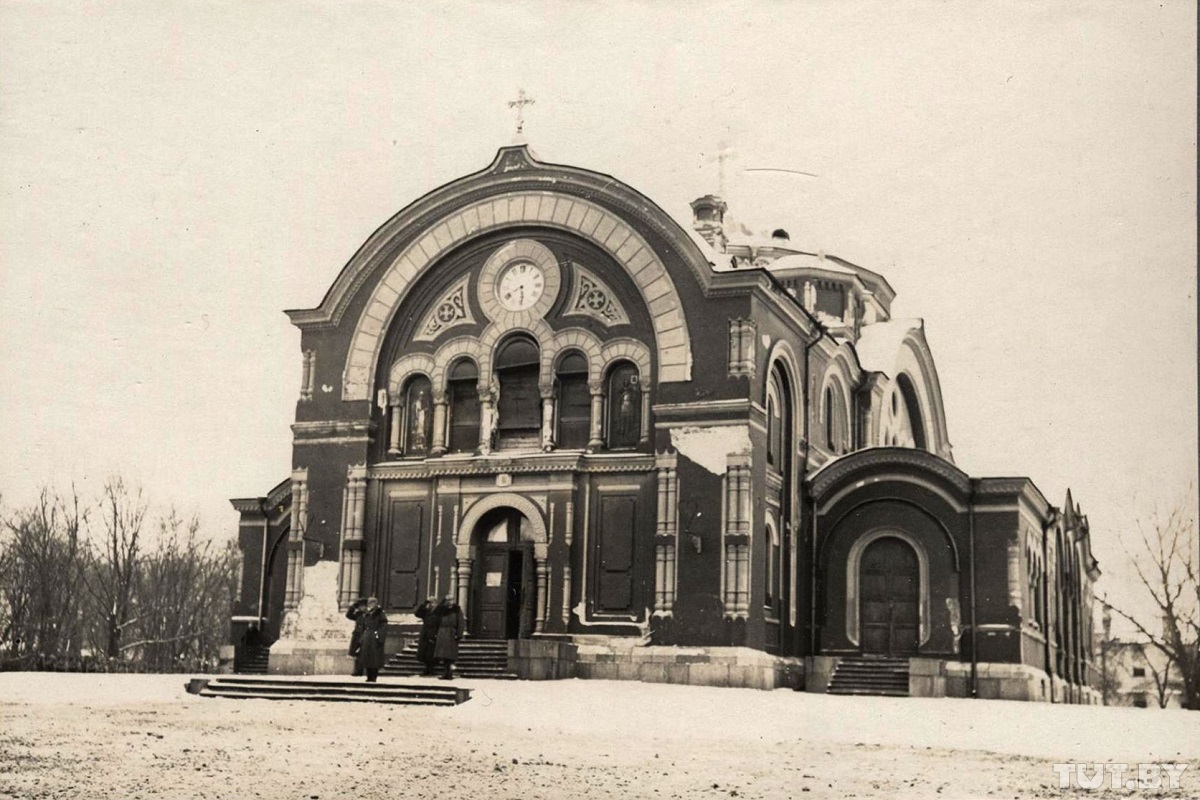 Одно из зданий, которое не пострадало во время пожара, — нынешняя Свято-Николаевская братская церковь на улице Мицкевича. Во время оккупации немцы использовали ее по назначению: поставили в храме лавочки и проводили протестантские службы. В обиходе ее называли Blauе Kirche — голубая церковь: