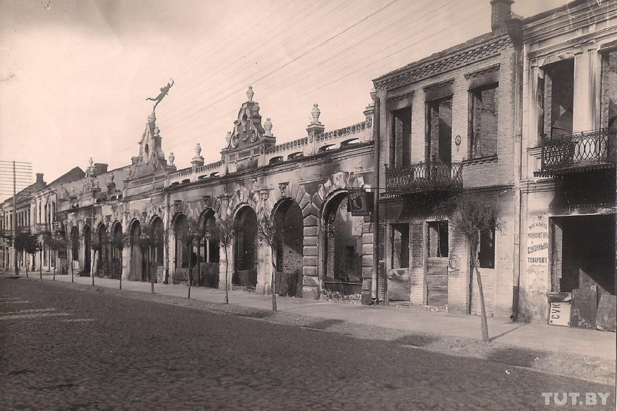 С улицы Карла Маркса идем на проспект Машерова, к новому зданию Центрального универмага. Здесь Иван достает из книги еще одну фотографию. В начале XX века эта улица называлась Шоссейная, а на месте ЦУМа стояли торговые ряды, где размещалось до 200 магазинов. Во время пожаров крыша и деревянные двери сгорели. На рыночном пятачке остался лишь кирпичный полуразрушенный каркас.