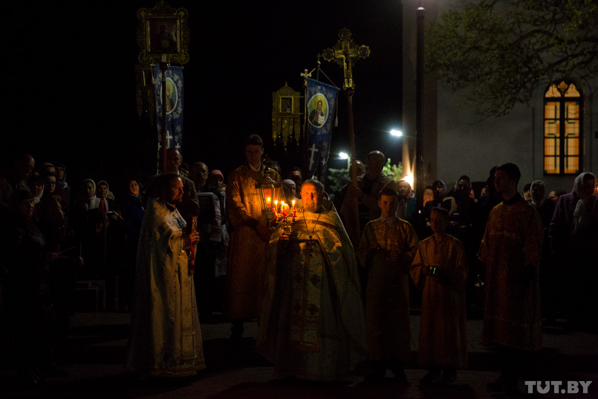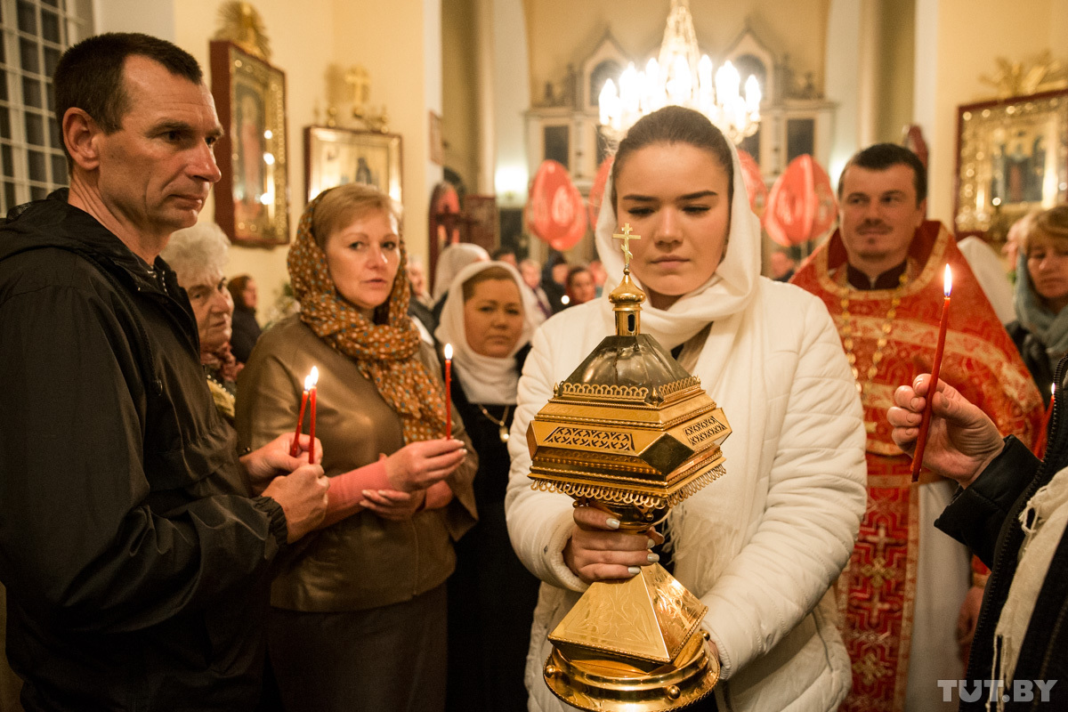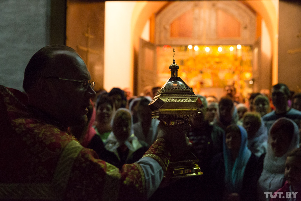 Ближе к часу ночи Благодатный огонь встречают в Кореличах, в храме святых апостолов Петра и Павла. Миновав около 160 километров от аэропорта до городского поселка, Олег, Андрей и Александр передают святыню протоиерею Николаю Орсе. От нее настоятель зажжет лампадку Лилии Лахач, которая повезет частичку Благодатного огня в Новогрудок