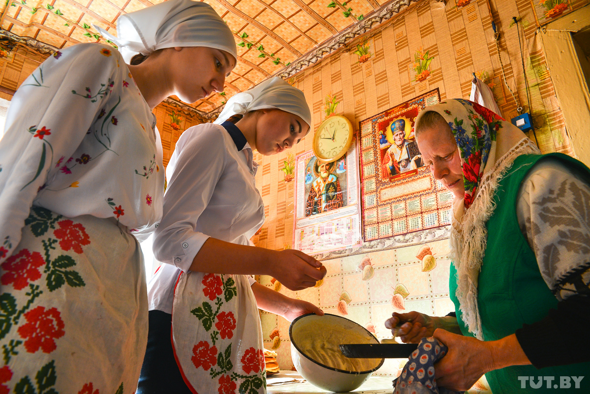 А у девчонок из 9-го и 10-го классов — двух Насть, Леры и Вероники — сегодня интегрированный урок белорусской литературы и трудового обучения. Да-да, у печи. Учитель тут — доярка на пенсии. Антонина Ивановна Лавриненко все свои 72 года прожила в соседней с Осиновкой деревне Нежковка. И сегодня она учит девчонок готовить в печи пышные блины. Рецепт, говорит, достался ей от свекрови.