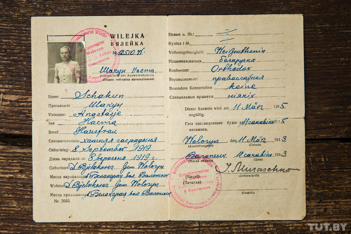 Удостоверение Анастасии Иодо, а после замужества Шакун. Здесь написано, что она была домохозяйкой, православной и белоруской