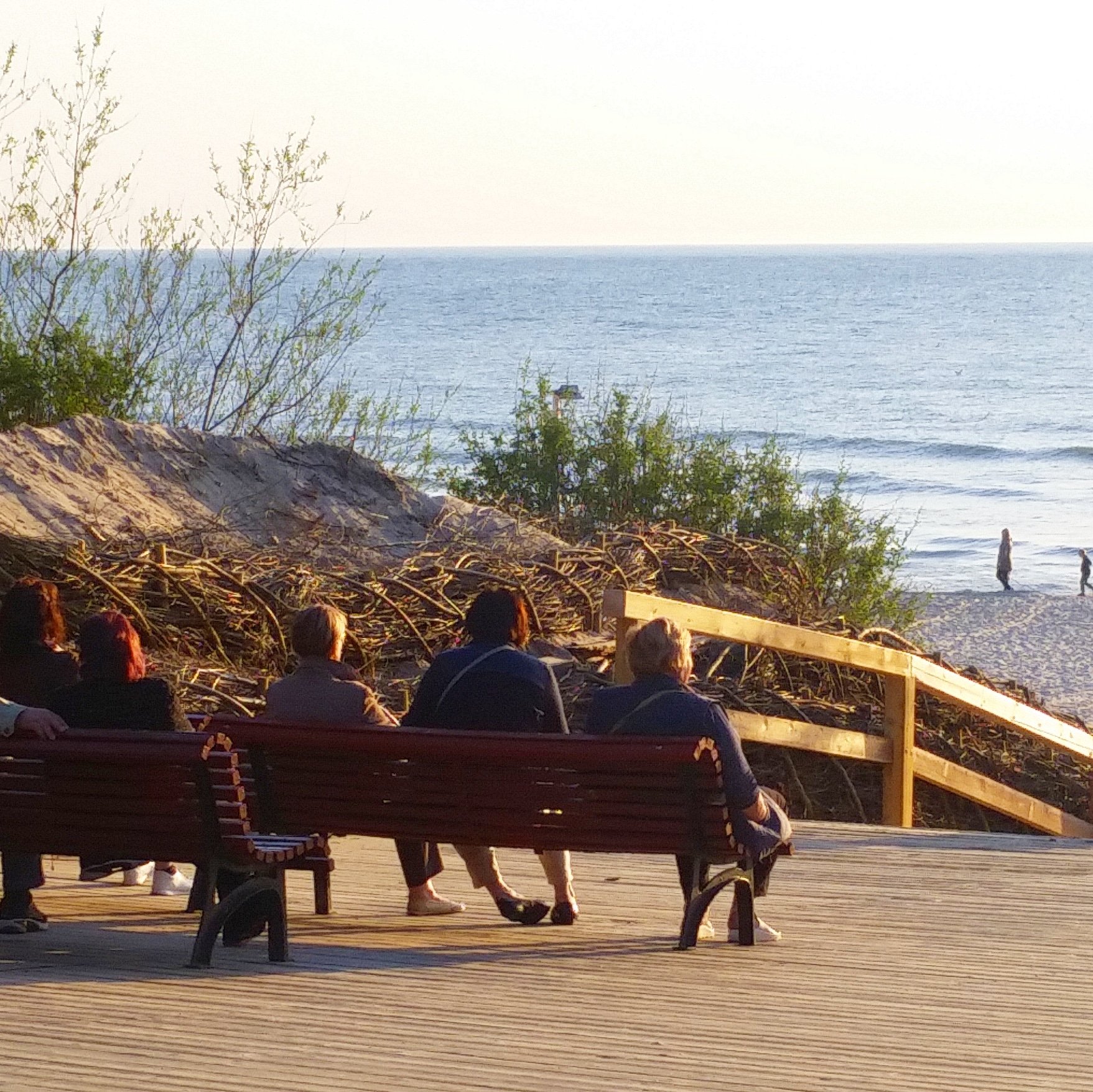 Вдоль Балтики километры просторного чистого пляжа с белым песком. Это рай для любителей пеших прогулок. С одной стороны шумное море, с другой — дюны и хвойный лес. И если утром немногие могут рано встать, то вечером к пирсу задолго до заката идут семьи, компании друзей, пенсионеры.