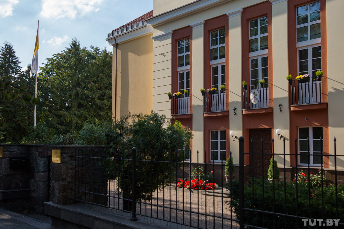 Возле самого здания и на окнах аккуратные цветы, справа от главного входа на солнце переливается скульптура Иоанна Павла II. Как уже ранее сообщалось в литовских СМИ, визит папы Франциска обойдется Литве в сумму около двух миллионов долларов.