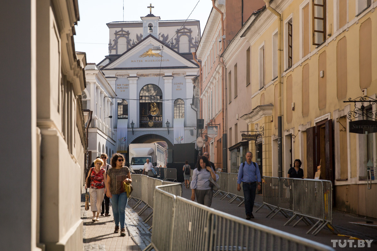 В пятницу с самого утра в городе кипит жизнь. Пока туристы бродят по узким улочкам и пьют кофе на летних террасах кафе, рабочие ведут последние приготовления: устанавливают большие экраны и ограждения, проверяют микрофоны. Возле Острой брамы, куда папа приедет в субботу днем, много католиков. Кто-то молится у образа Матери Божьей, кто-то заходит внутрь, чтобы побыть в тишине.