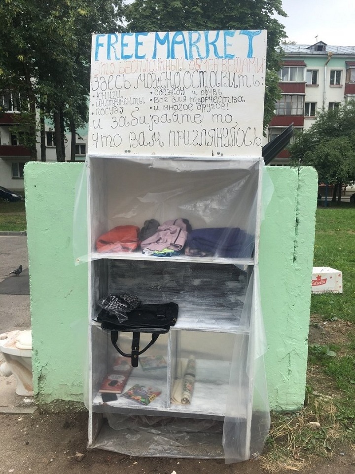 В одном из дворов по улице Короля в Минске появился стеллаж с вывеской «Free market». Об этом сообщает «Наша Ніва».