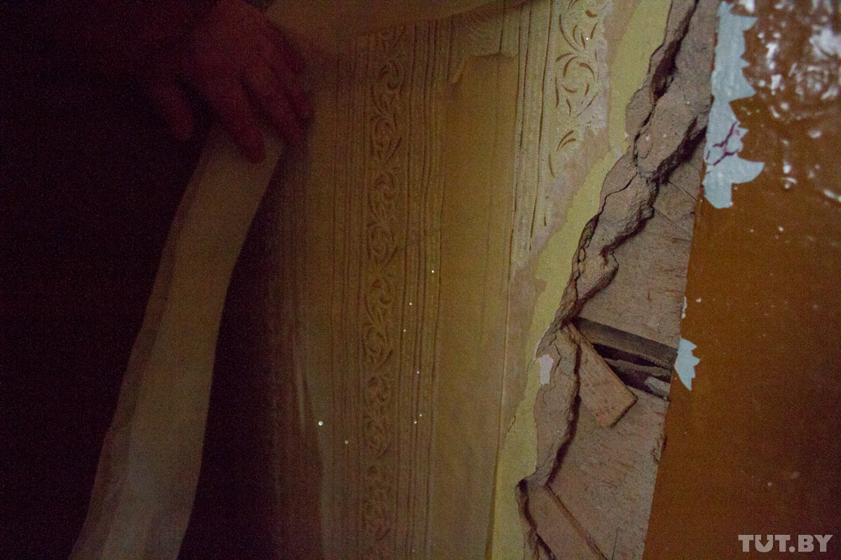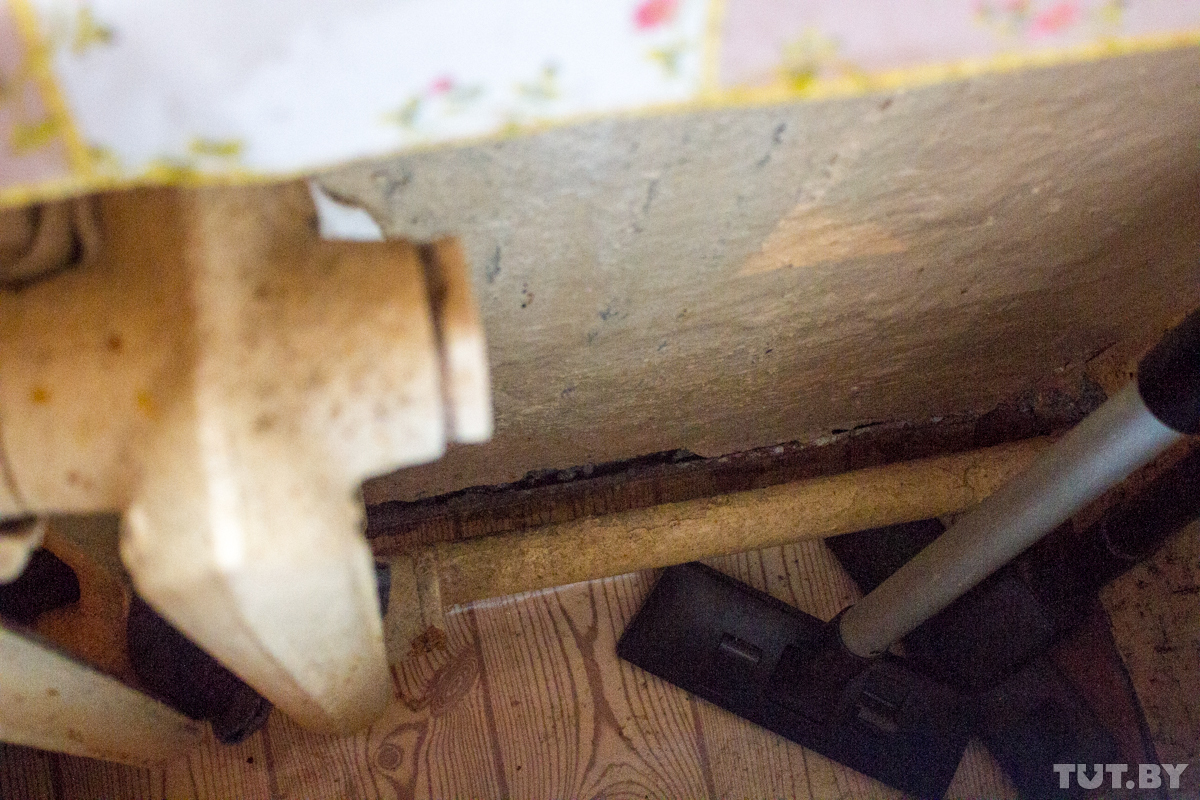 Людмила отгибает край обоев, которые не держатся на стене. Под ним — сыплющаяся «дранка», между стеной и полом — щель, в которую маленький ребенок может засунуть ладонь. Объясняет: