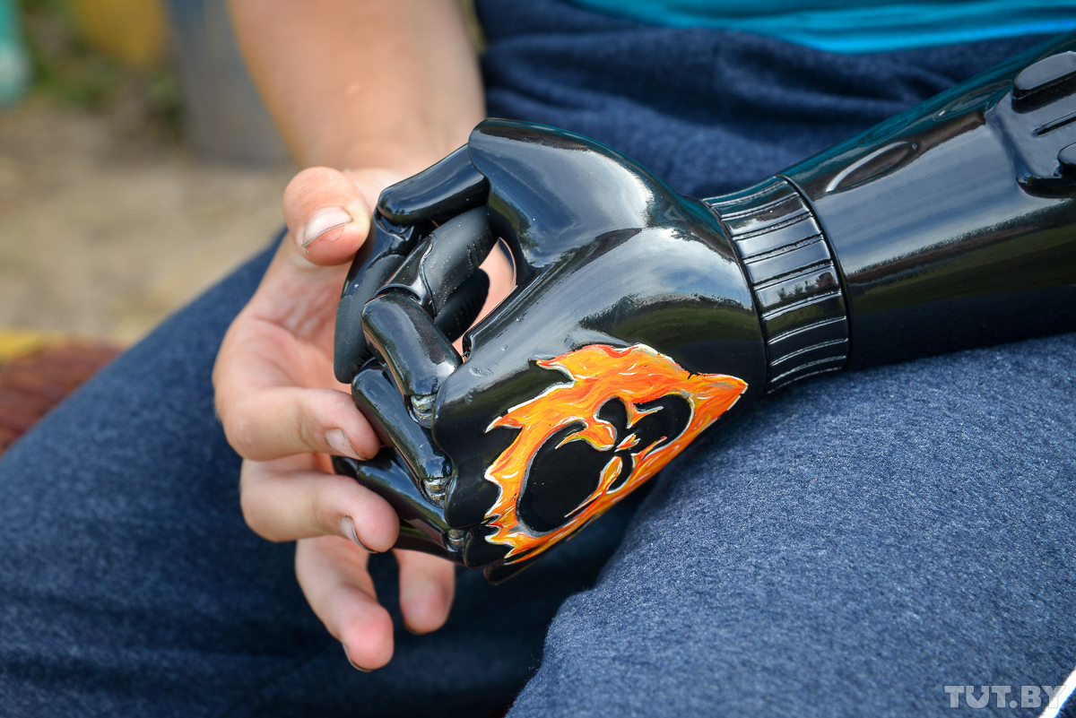 Последние пару месяцев поводом для внимания служит новый протез — глянцевый черный с изображением черепа в огне на тыльной стороне искусственной кисти. Его напечатали для мальчика на 3D-принтере, а такой дизайн — выбор самого Никиты.