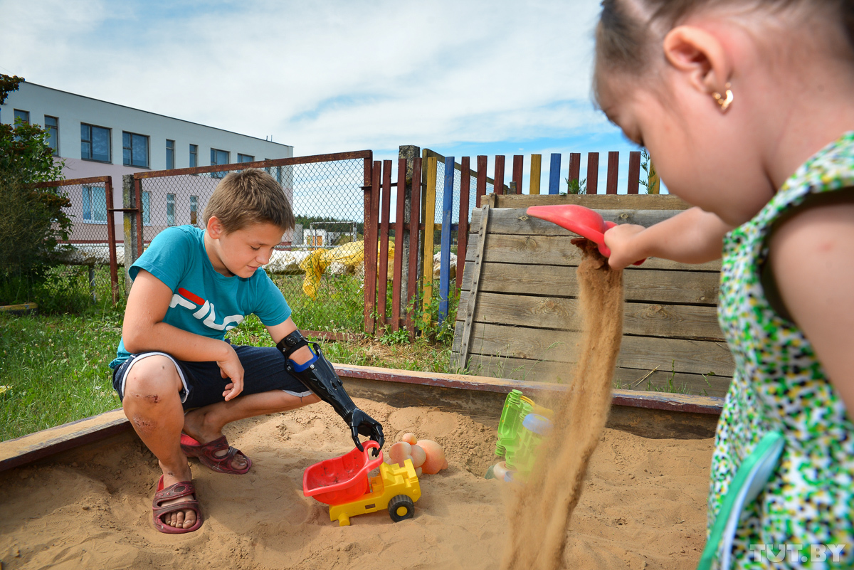 Пока мы разговариваем с Анной, Никита носится по детской площадке с младшей сестрой. Пинает мячик, перескакивает за ним за забор и обратно. Без протеза. Потому что так ему привычнее, говорит мать, да и патрон, куда вставляется рука, ужасно потеет в такую жару.