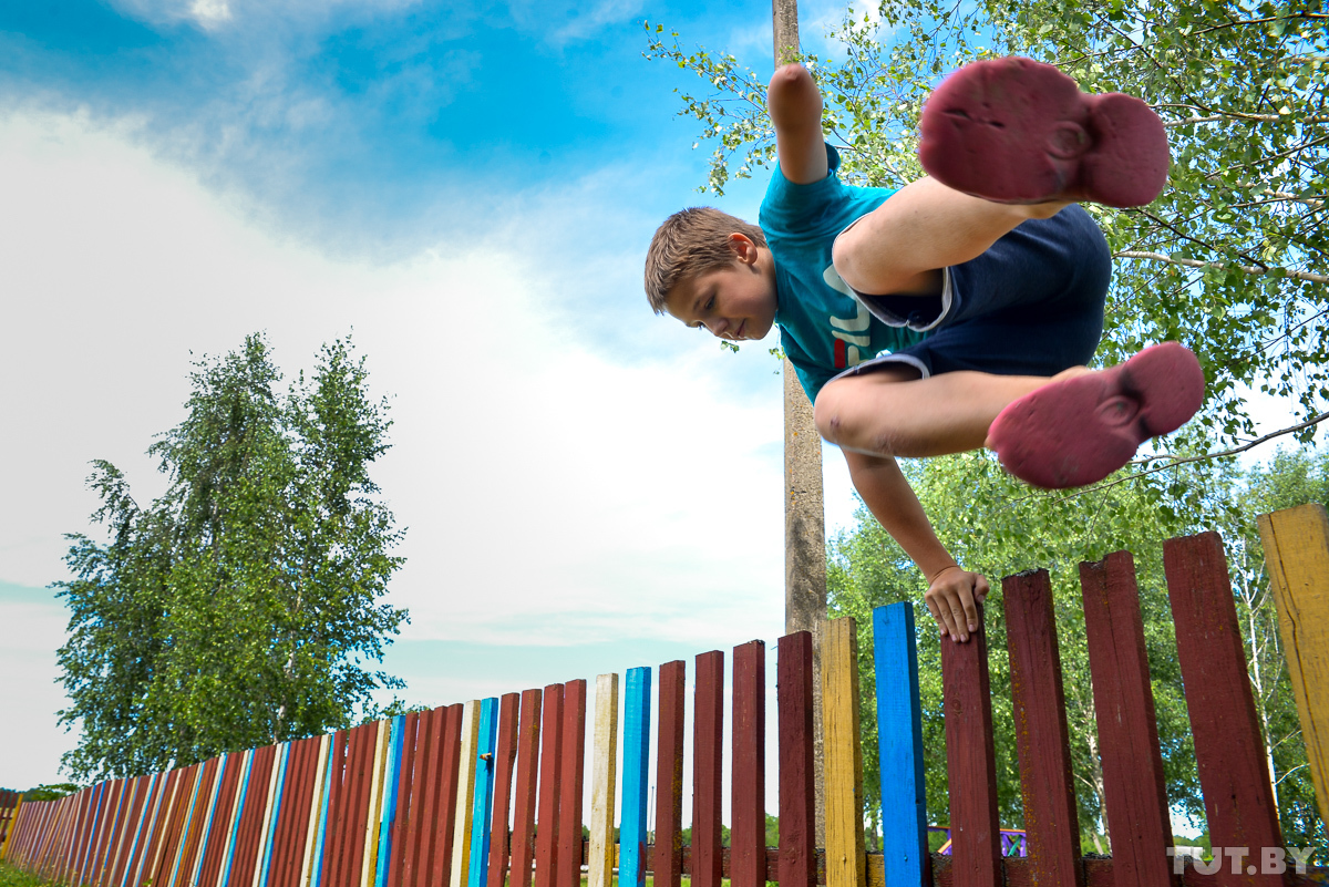 — Изи [от англ. easy — легко. — Прим. TUT.BY], — бросает Никита — и через секунды стоит на верхней перекладине. То же самое, но с протезом, мальчишка делает в разы медленнее.