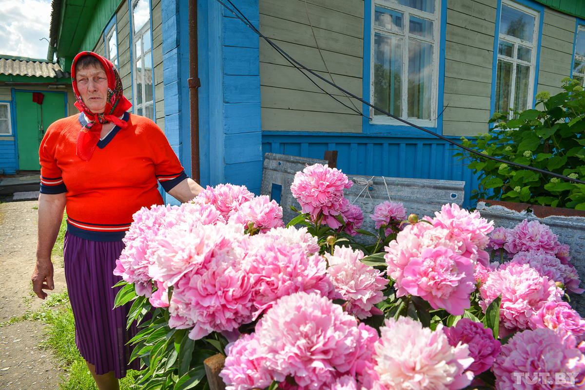 Женщина с ходу раскрывает секрет потрясающе красивых пионов: растут они на «красном углу». И рассказывает, что хату эту строили вместе с «хозяином», то есть мужем, который 6 лет как умер.