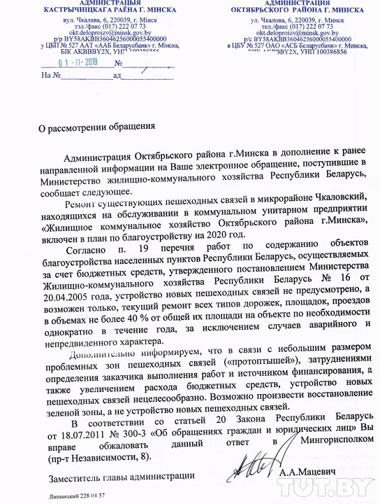 Ответ администрации Октябрьского района Минска от 1 ноября 2019 года. Фото: пользователь TUT.BY