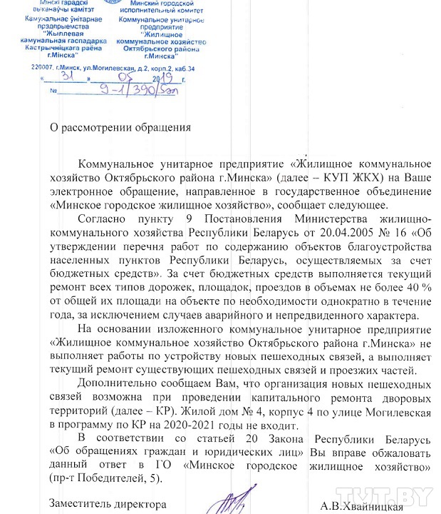 Ответ из ЖКХ Октябрьского района Минска от 31 мая 2019 года