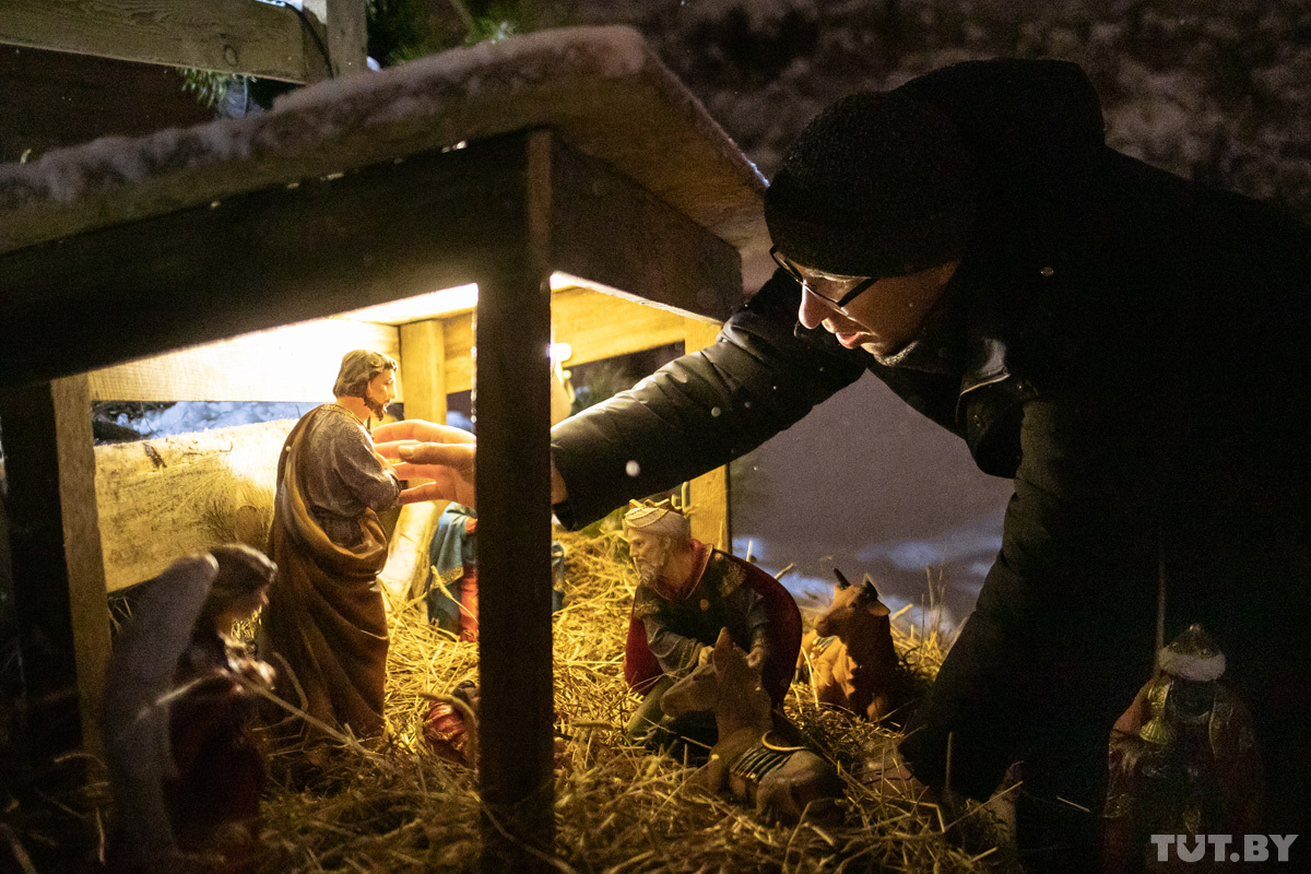 Брат Андрей берет в руки фигурку Марии и долго на нее смотрит. Затем ставит ее в вертеп, достает другие фигурки. Снег присыпает крышу импровизированного сарая, где уже стоит все святое семейство, волхвы, а на них из яслей смотрит младенец Иисус.