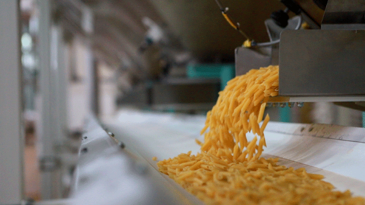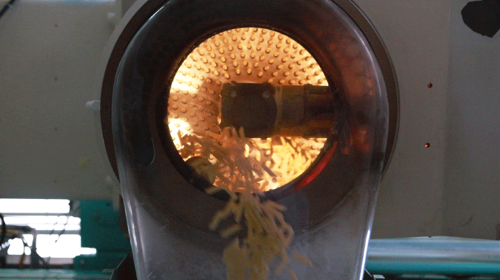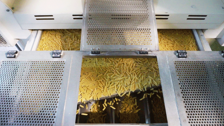Для того чтобы изделия не слипались между собой и «запомнили» свою форму, после резки они попадают в вибросушилку. Там макаронные изделия подсушиваются горячим воздушным потоком.