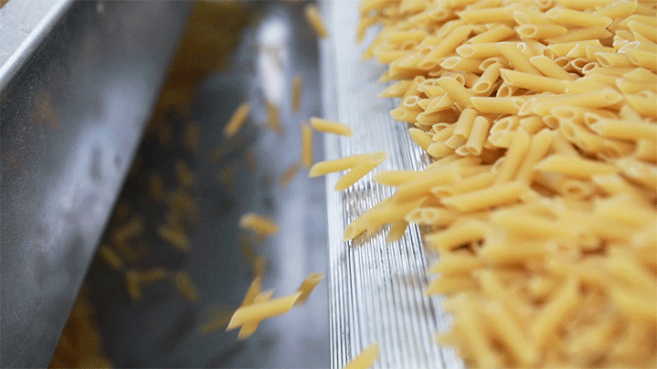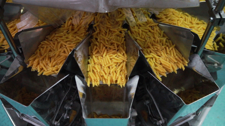 После выхода из бункера макаронные изделия попадают на транспортер — для доставки их к упаковочному автомату.