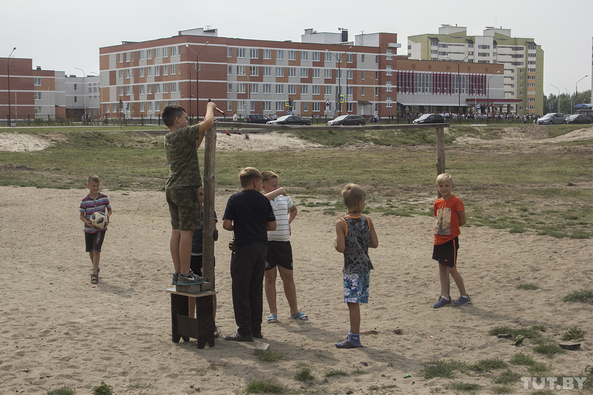 Дети ремонтируют деревянные футбольные ворота на пустыре возле новой школы. Ожидается, что учебное заведение станет местом отдыха для жителей микрорайона