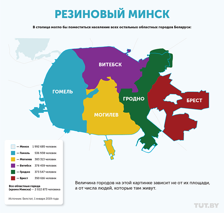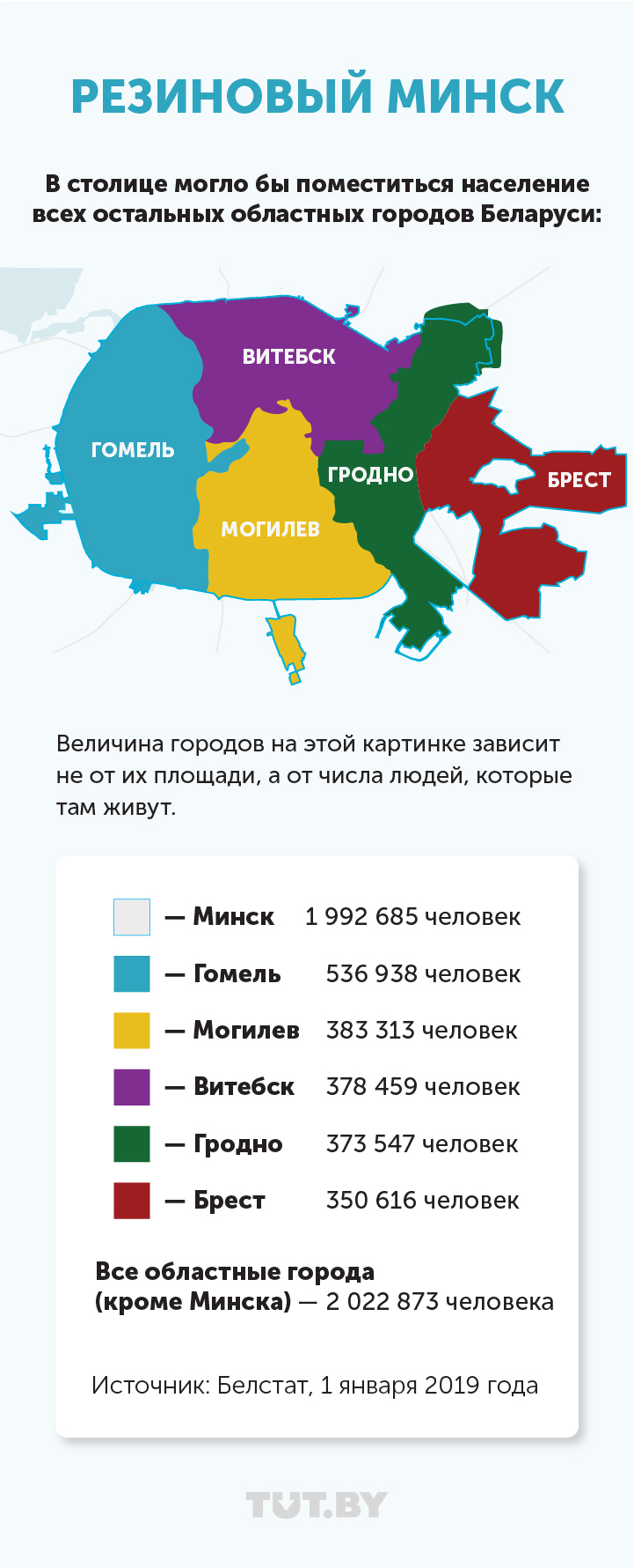 Наше изображение — условно. Буквален посыл: население всех других крупных городов Беларуси и правда (почти) поместилось бы в Минске.