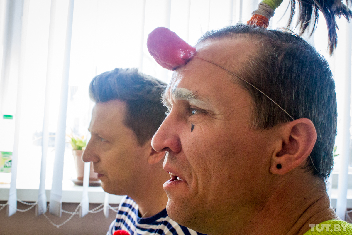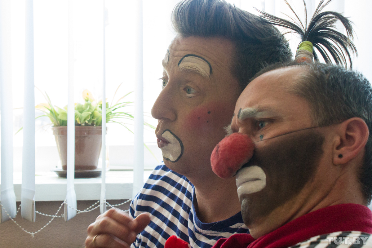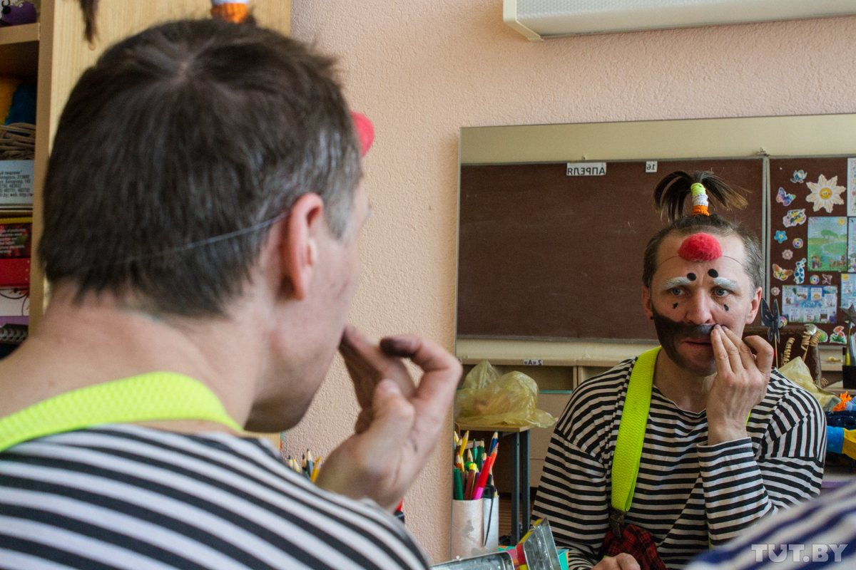 Сегодня в гримерке — два клоуна: бобруйский Жорик и немецкий с русскими корнями Дим-Дим, он же Дмитрий Шмидт. Дмитрий родился в России, но переехал в Германию как потомственный немец. Там он работает научным сотрудником в медучреждении, а последние четыре года — еще и клоуном. Просто потому, что ему это нравится. А в Бобруйск приехал по приглашению Юрия — выступить на фестивале клоунов и перед особенными детьми во вспомогательной школе.