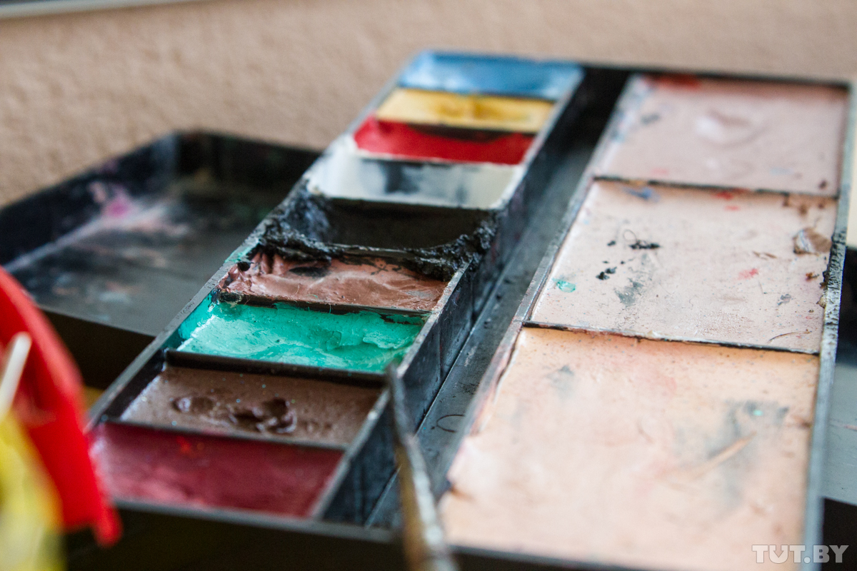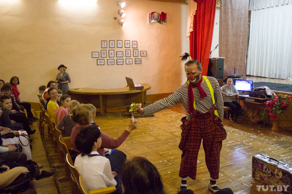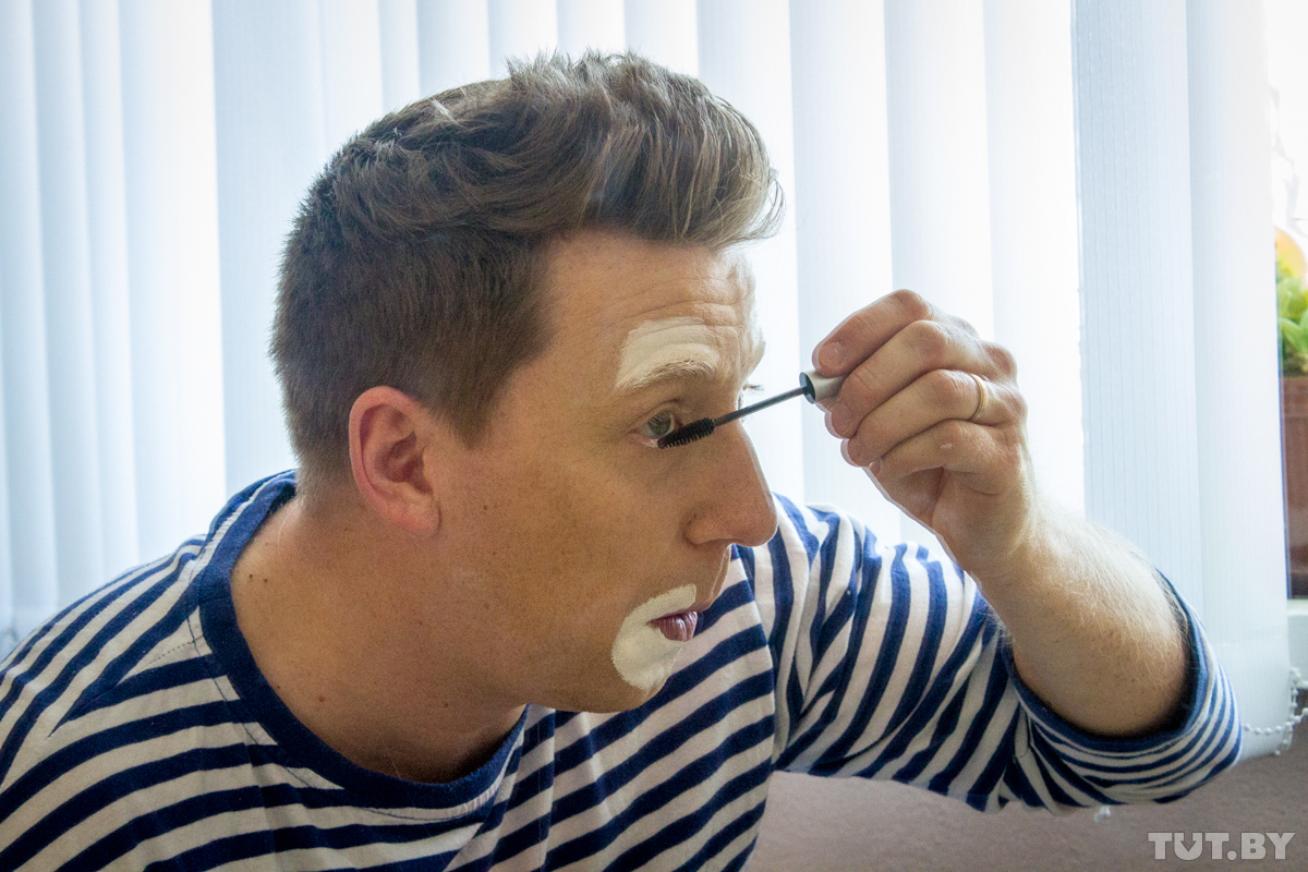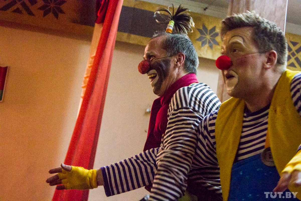 Сегодня в гримерке — два клоуна: бобруйский Жорик и немецкий с русскими корнями Дим-Дим, он же Дмитрий Шмидт. Дмитрий родился в России, но переехал в Германию как потомственный немец. Там он работает научным сотрудником в медучреждении, а последние четыре года — еще и клоуном. Просто потому, что ему это нравится. А в Бобруйск приехал по приглашению Юрия — выступить на фестивале клоунов и перед особенными детьми во вспомогательной школе.