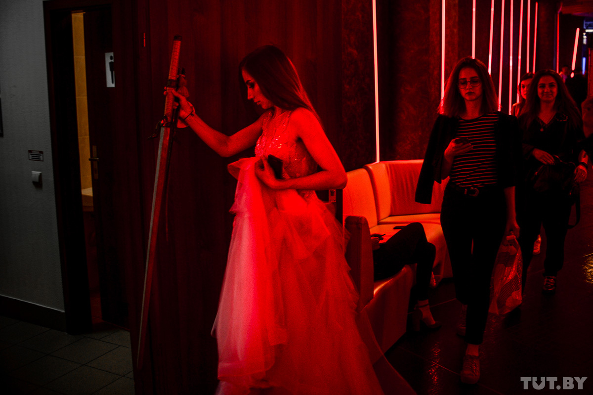 Перед началом мероприятия девушки уже стояли за кулисами. Одна из участниц из Барановичей рассказала, что привезла в Минск две большие сумки личных вещей: «Наряды привозила группа поддержки, это все в две сумки просто не поместилось бы!»