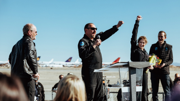 Бет Мозес празднует успешное прибытие на Землю из космоса, Virgin Galactic