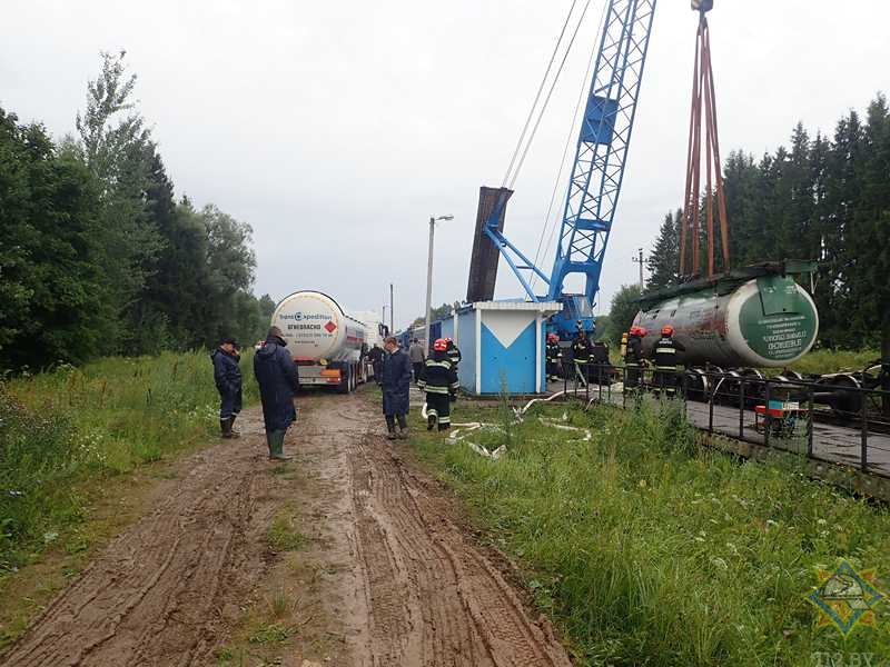 Напомним, в среду, 24 июля, на участке Витебск — Орша вблизи деревни Замосточье сошли с рельсов 15 цистерн грузового поезда (всего 68 вагонов в составе, в том числе 39 цистерн с газом, 1 вагон с древесиной, 28 порожних полувагонов). При аварии никто не пострадал. В одной из цистерн обнаружили утечку пропана.