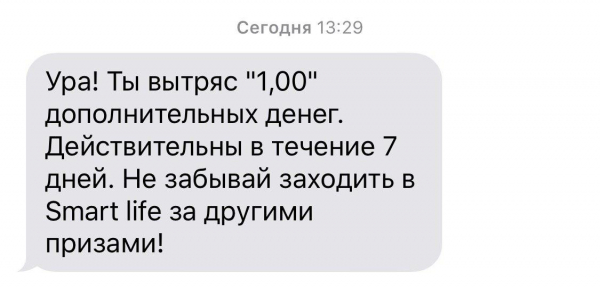Мы проверили: деньги на самом деле зачислились на бонусный счет после «тряски» смартфона с запущенным приложением, что подтвердило SMS-сообщение: